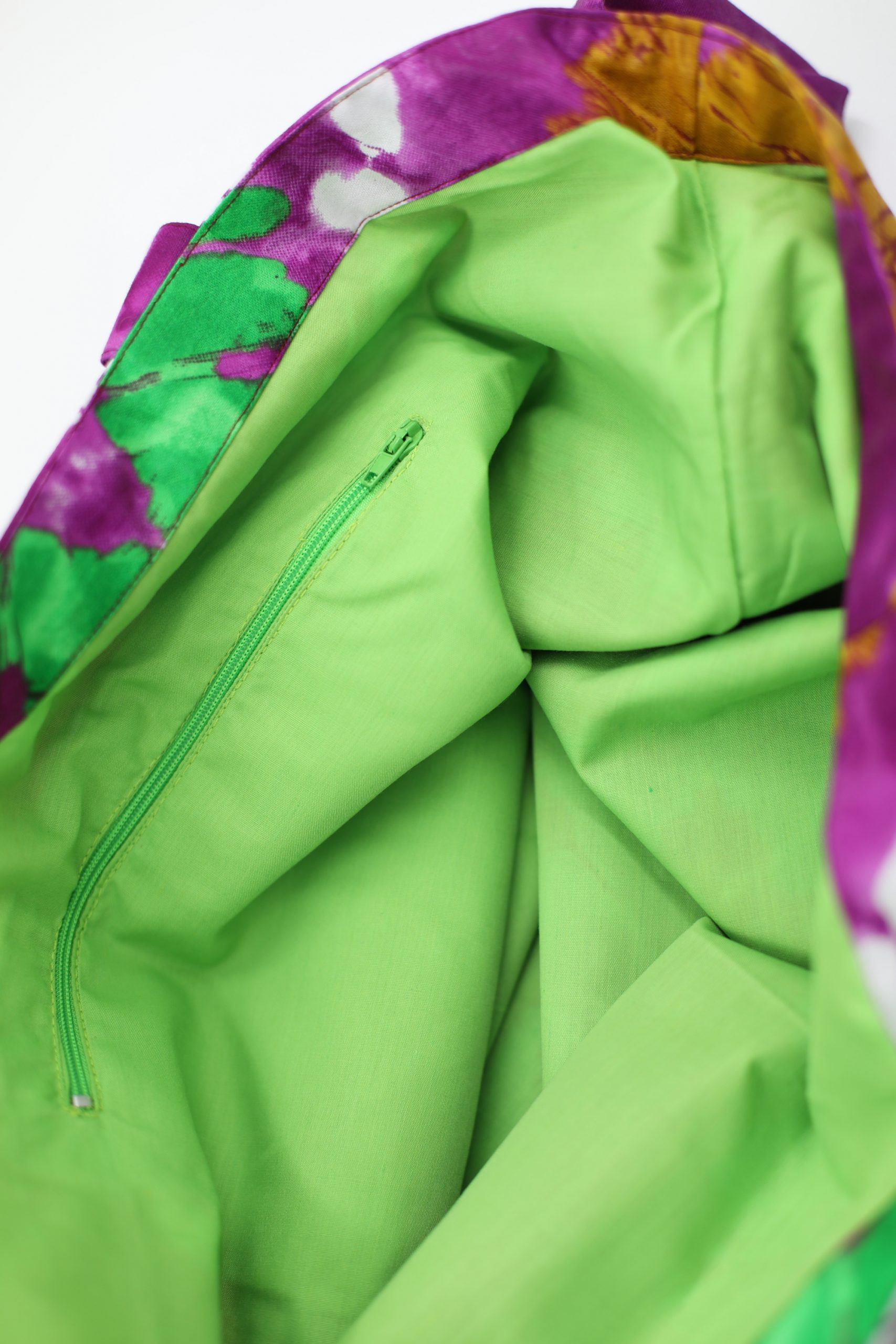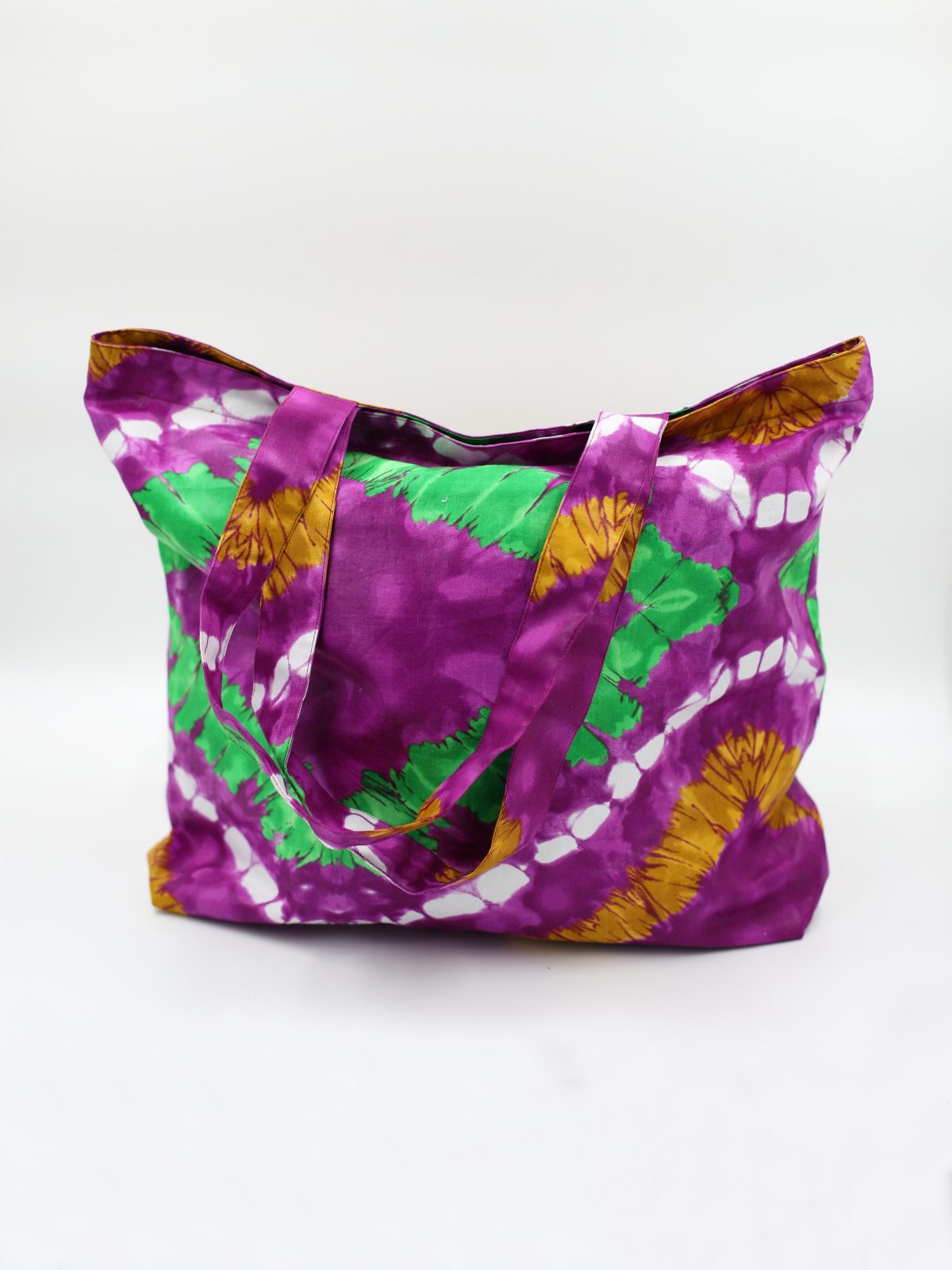 Unikalna, batikowa torba typu tote w oryginalnym połączeniu kolorystycznym – fiolet i zieleń. Torba została ręcznie uszyta w Senegalu przez uczennicę szkoły zawodowej Foyer Maria Goretti. Torba jest bardzo wytrzymała – świetnie sprawdzi się podczas zakupów.