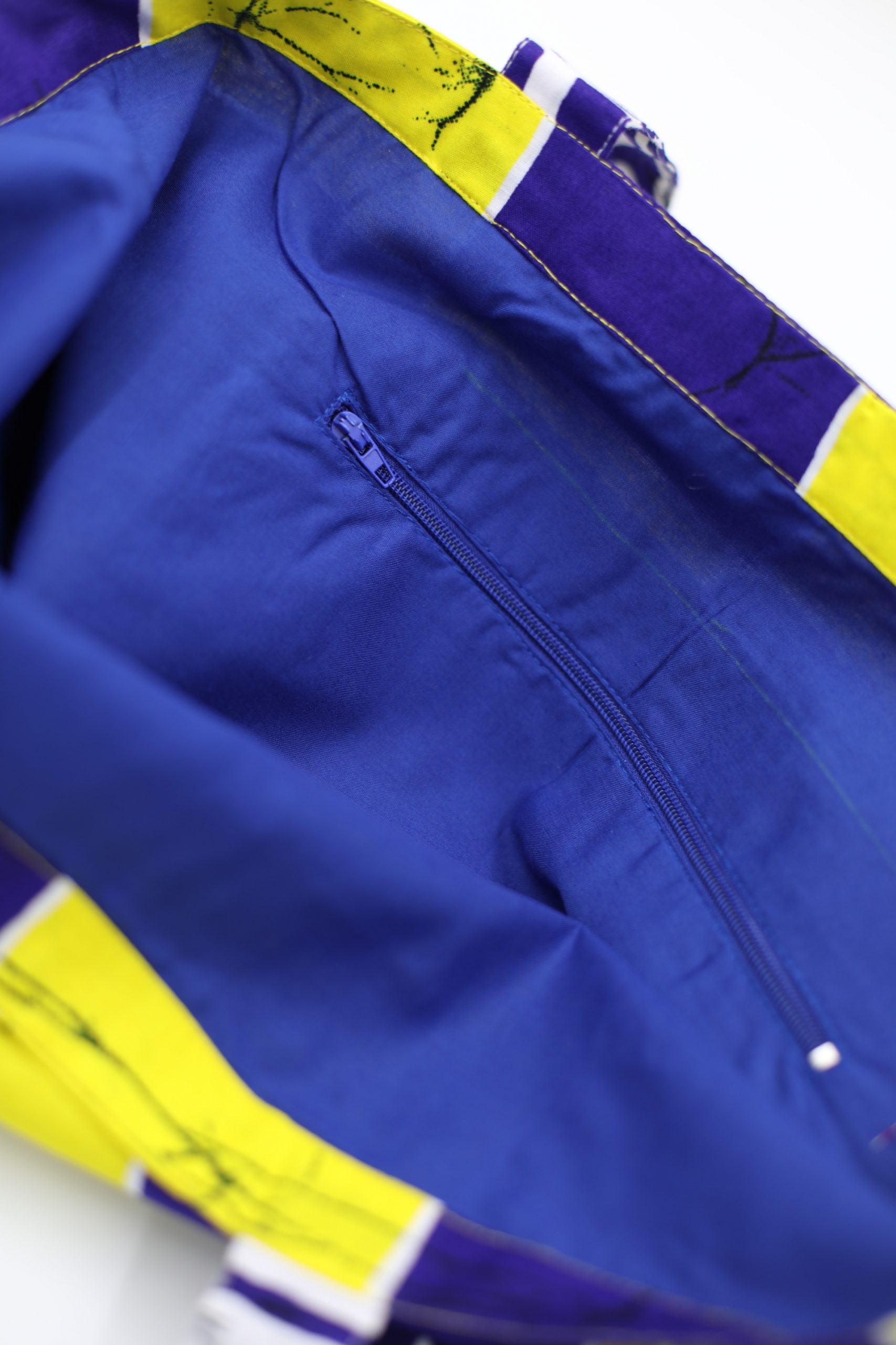 Unikalna, batikowa torba typu tote w oryginalnym połączeniu kolorystycznym – indygo i żółty. Torba została ręcznie uszyta w Senegalu przez uczennicę szkoły zawodowej Foyer Maria Goretti. Torba jest bardzo wytrzymała – świetnie sprawdzi się podczas zakupów.