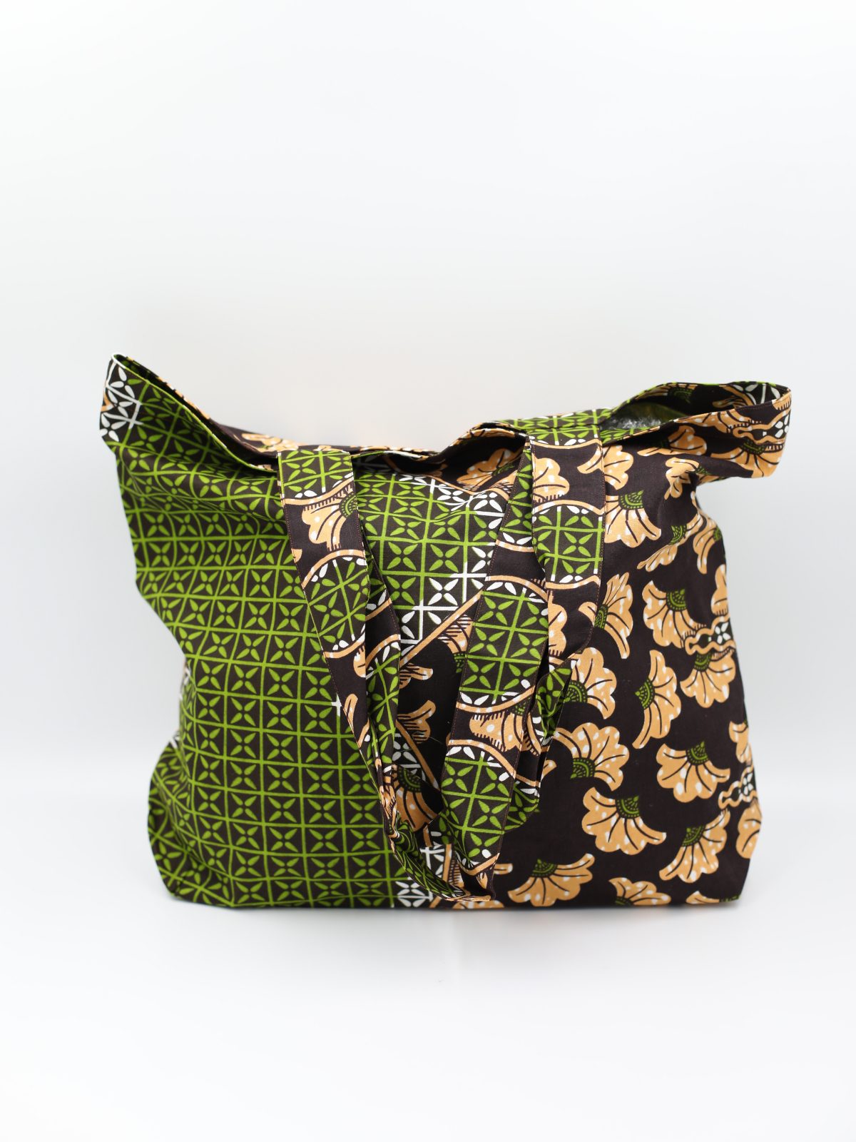 Unikalna, batikowa torba typu tote w oryginalnym połączeniu kolorystycznym – zieleń i brąz. Torba została ręcznie uszyta w Senegalu przez uczennicę szkoły zawodowej Foyer Maria Goretti. Torba jest bardzo wytrzymała – świetnie sprawdzi się podczas zakupów.