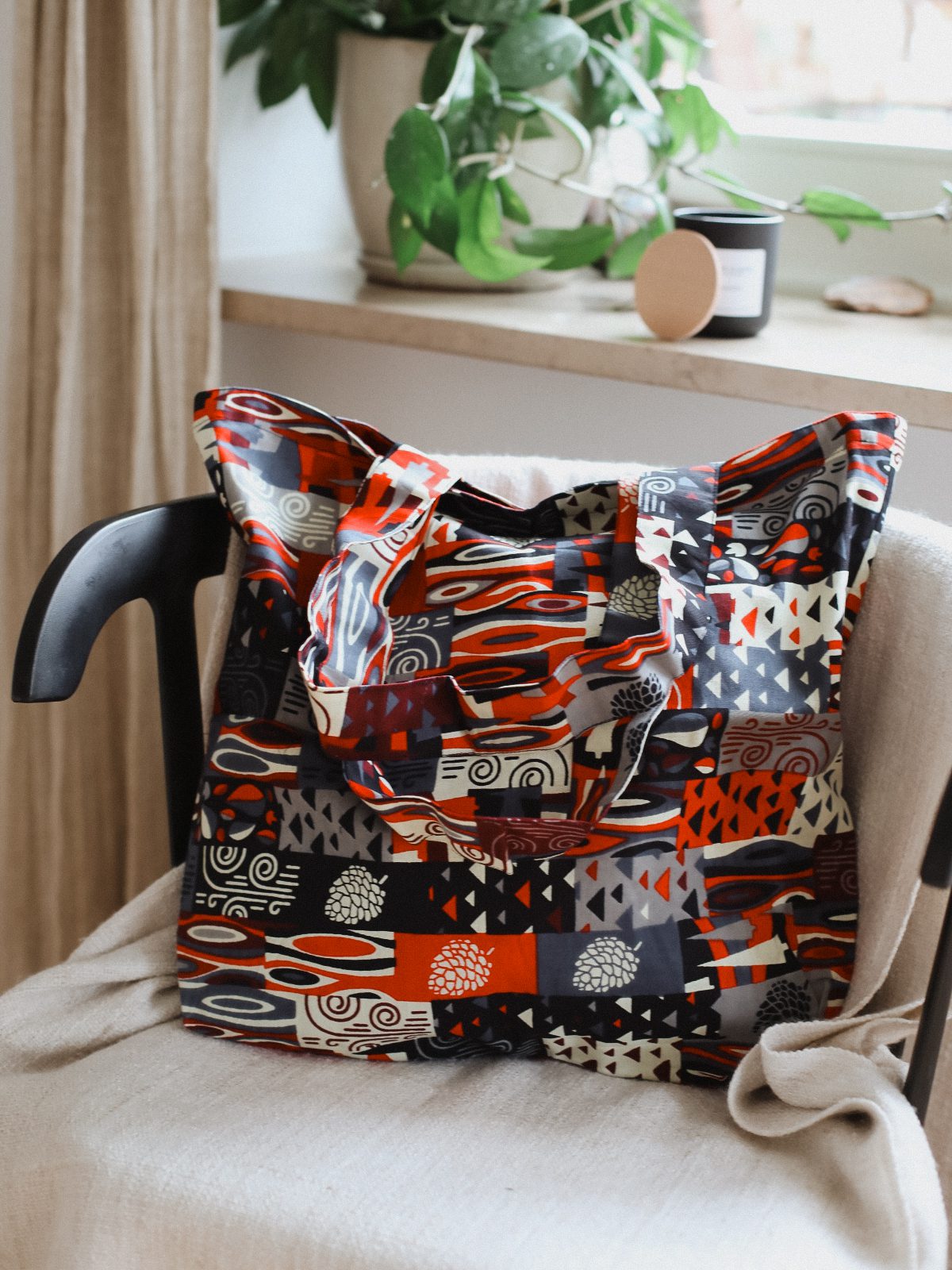 Oryginalna batikowa torba typu tote w intensywnych odcieniach czerwieni, szarości, czerni i bieli, ozdobiona różnorodnymi geometrycznymi i etnicznymi wzorami. Torba została ręcznie uszyta w Senegalu przez uczennicę szkoły zawodowej Foyer Maria Goretti. Wykonana z wytrzymałego materiału, idealnie nadaje się na zakupy lub do codziennego użytku. Wewnątrz znajduje się praktyczna kieszonka zamykana na zamek błyskawiczny, która pomieści najpotrzebniejsze drobiazgi.