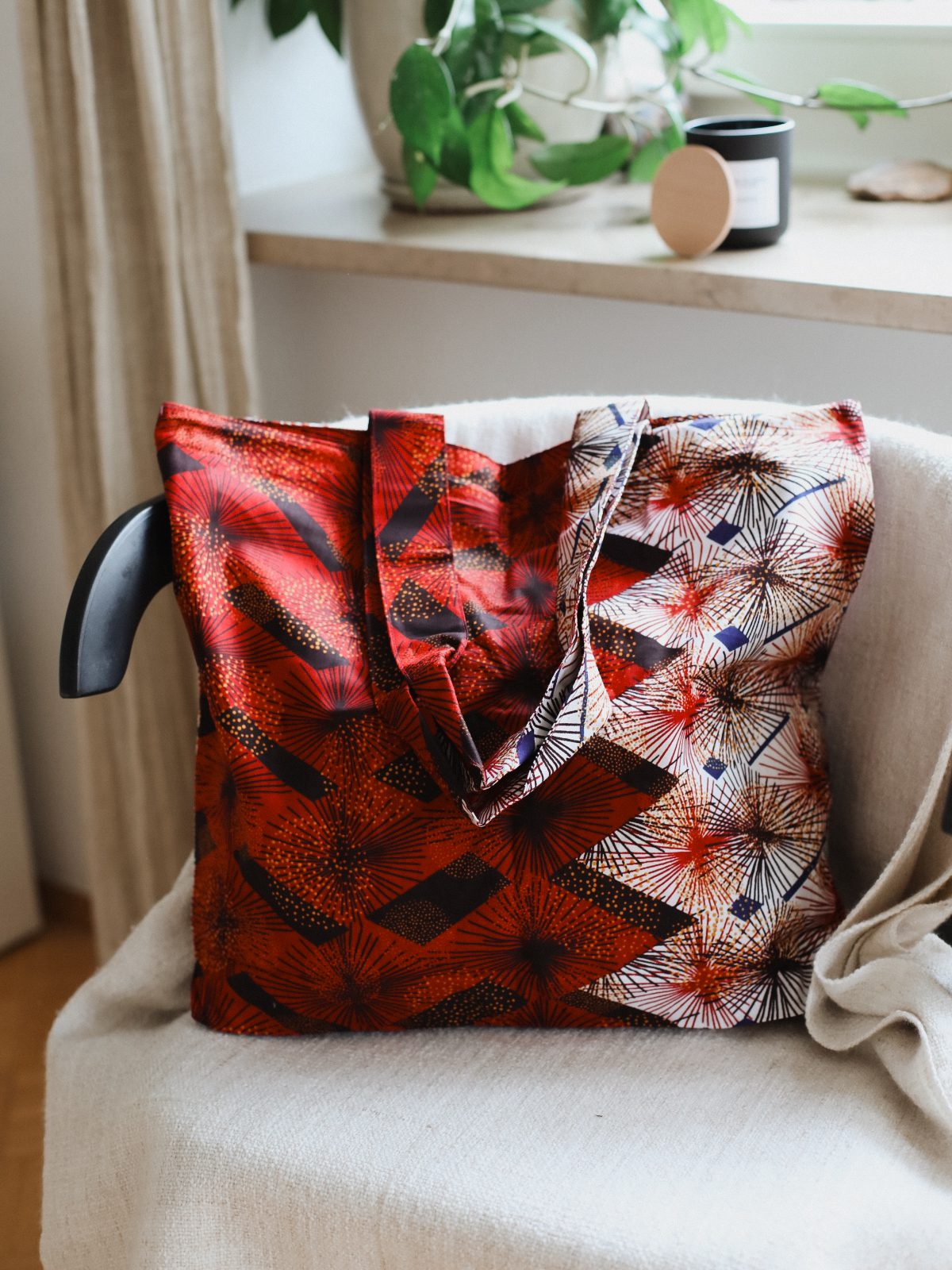 Unikalna, batikowa torba typu tote w odcieniach czerwieni, czerni i bieli, ozdobiona finezyjnym, geometrycznym wzorem. Torba została ręcznie uszyta w Senegalu przez uczennicę szkoły zawodowej Foyer Maria Goretti. Trwały materiał sprawia, że torba doskonale nadaje się na zakupy. Jej dodatkowym atutem jest praktyczna, zamykana na zamek błyskawiczny kieszonka, idealna do przechowywania drobiazgów.
