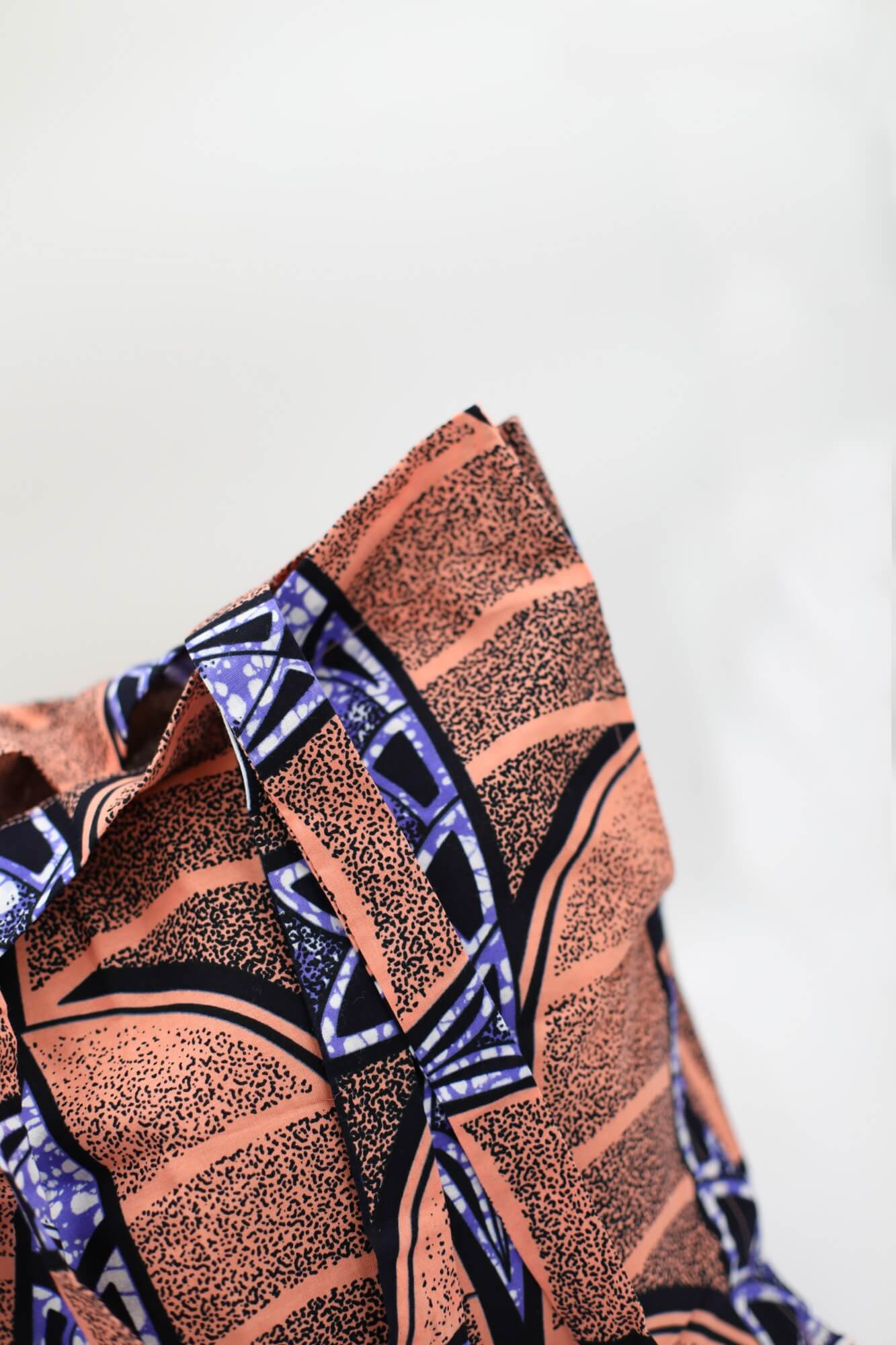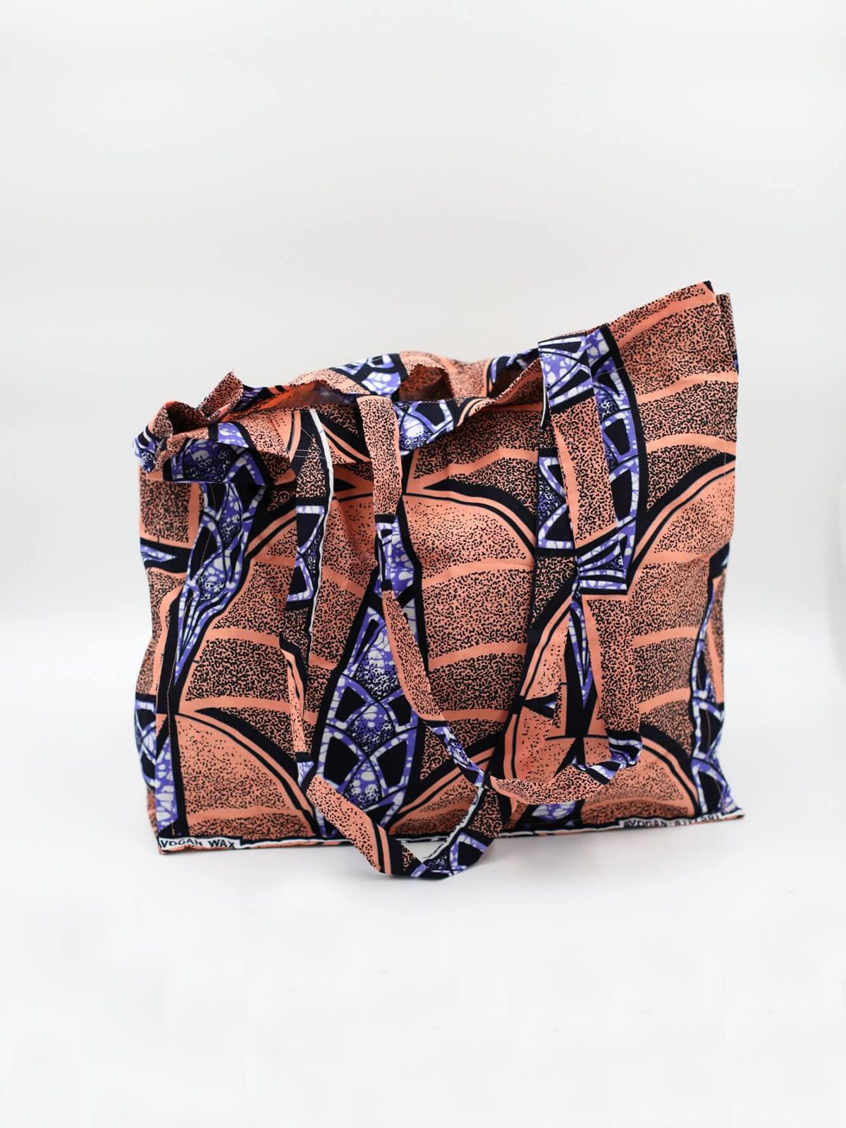 Unikalna, batikowa torba typu tote w oryginalnym połączeniu kolorystycznym – łososiowy, czarny i fioletowy. Torba została ręcznie uszyta w Senegalu przez uczennicę szkoły zawodowej Foyer Maria Goretti. Torba jest bardzo wytrzymała – świetnie sprawdzi się podczas zakupów.