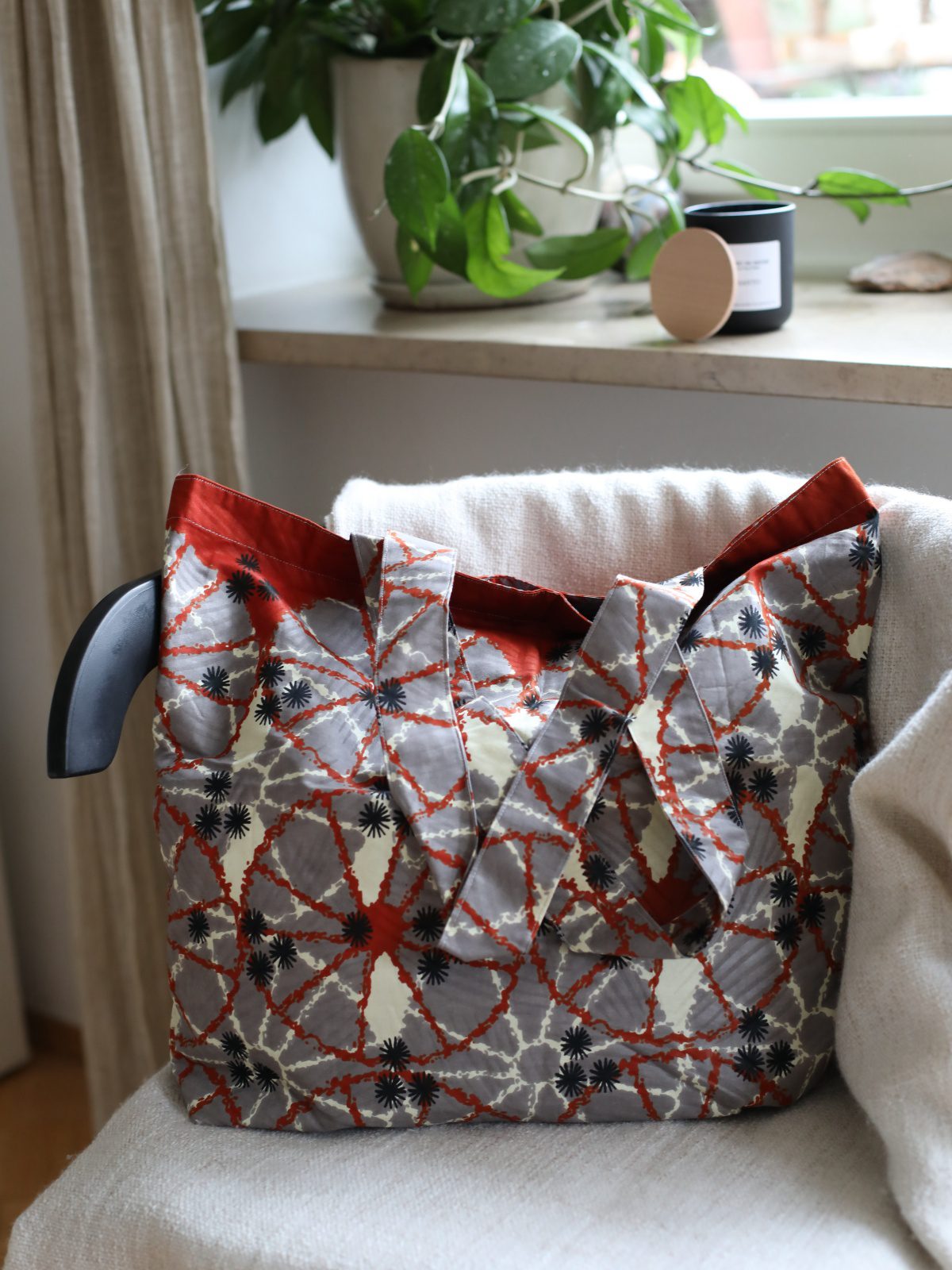 Unikalna, batikowa torba typu tote w oryginalnym wzorze w odcieniach szarości, czerwieni i czerni. Torba została ręcznie uszyta w Senegalu przez uczennicę szkoły zawodowej Foyer Maria Goretti. Jest bardzo wytrzymała – doskonale sprawdzi się podczas zakupów czy codziennych wyjść. Wewnątrz posiada praktyczną kieszonkę zamykaną na zamek błyskawiczny, idealną na klucze, telefon czy inne drobiazgi.