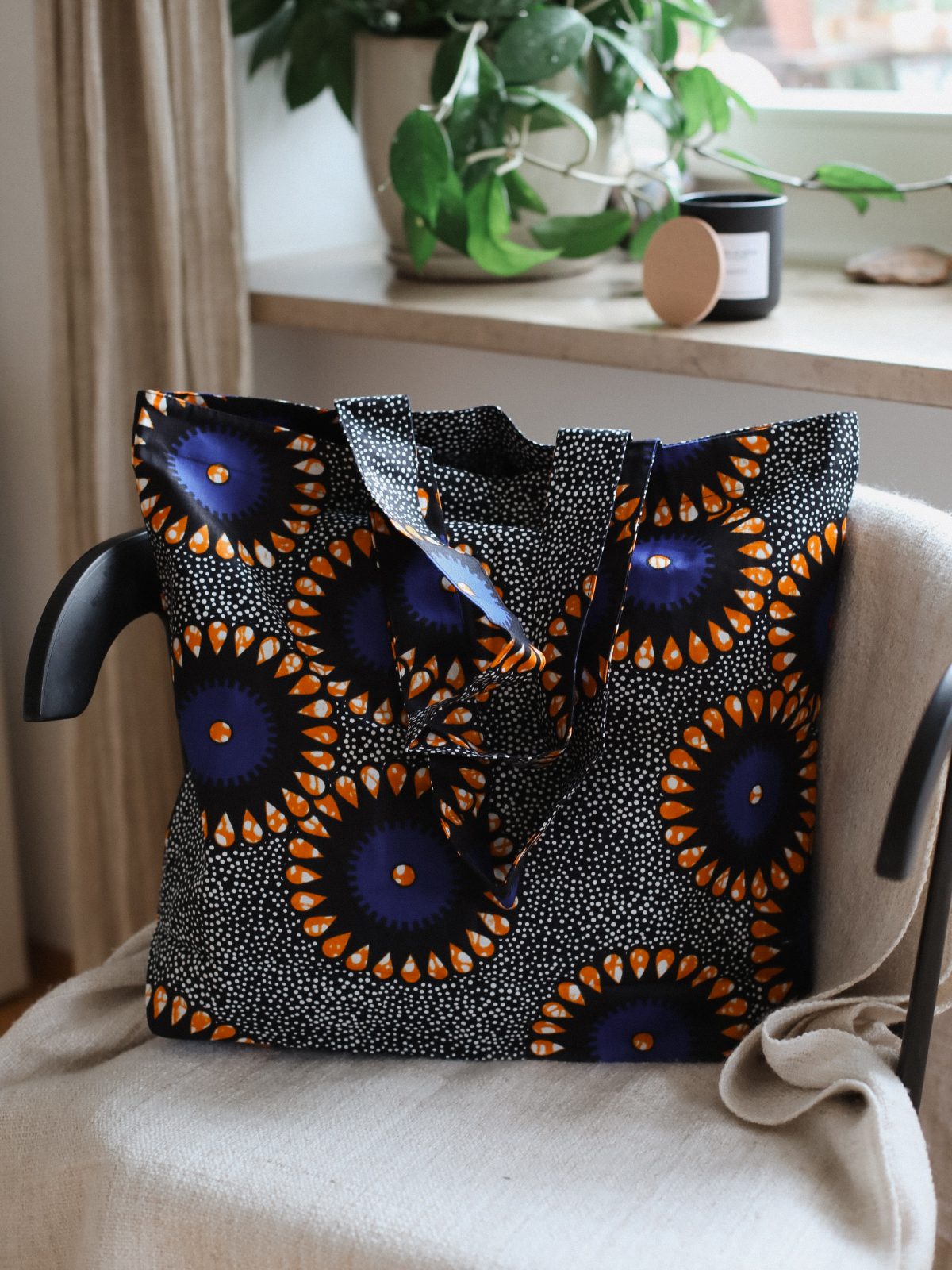 Intensywny granat i czerń przełamane pomarańczowymi akcentami tworzą wzór, który przyciąga uwagę i nadaje torbie wyjątkowego charakteru. Ręcznie uszyta w Senegalu przez uczennice szkoły zawodowej Foyer Maria Goretti, torba łączy tradycyjne rzemiosło z nowoczesnym stylem. W środku znajduje się zamykana na zamek kieszonka, idealna na klucze, telefon czy inne drobiazgi.
