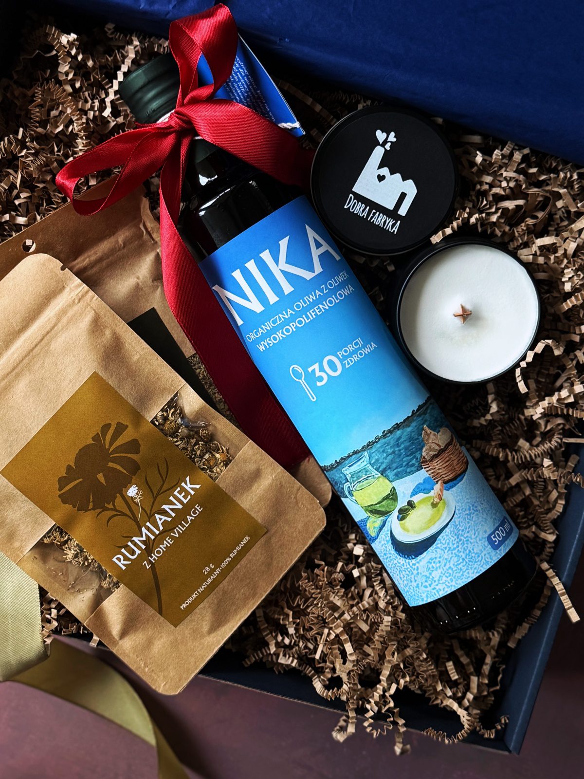 W środku boxa znajdziesz wysokopolifenową oliwę NIKA, tłoczoną u źródła, pełną naturalnych antyoksydantów i jakości, która rodzi się z uważnej, uczciwej uprawy. Do wyboru pojemność 250ml lub 500ml. Obok niej – dwie losowe mieszanki ziół prosto z greckiego Home Village, suszonych naturalnie na słońcu: tymianek, oregano, mięta, szałwia, rozmaryn lub rumianek. Wszystkie powstają w tym samym miejscu, z tej samej ziemi. Na koniec dopełnienie całego boxa – pięknie pachnąca świeca sojowa, 100% naturalna, lekko cytrusowa i drzewna o pojemności 100ml.