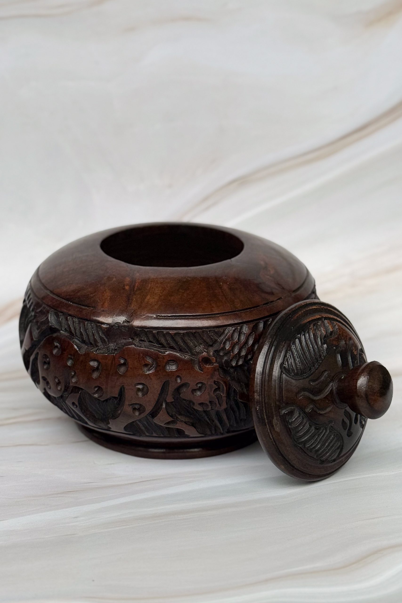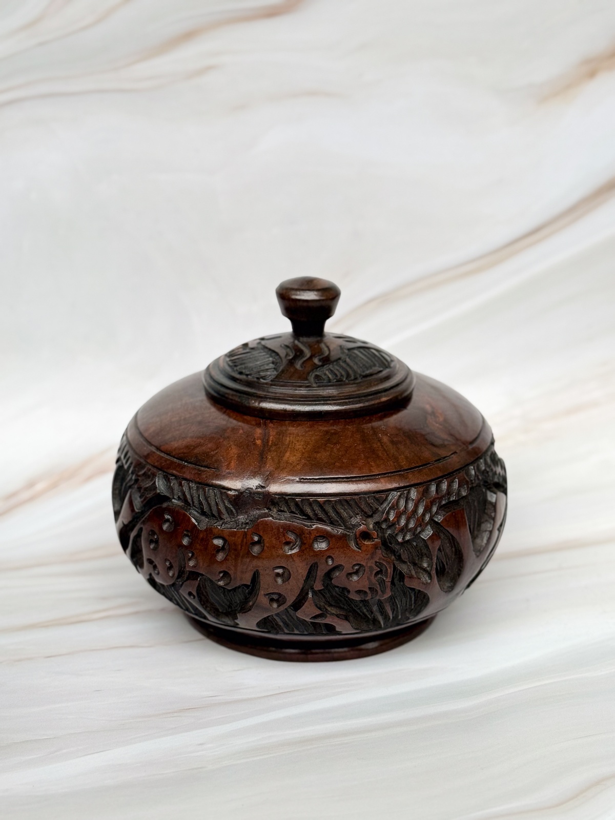Ręcznie wykonana cukiernica z hebanu, jednego z najbardziej szlachetnych i cenionych gatunków drewna. Ozdobiona starannym, wypukłym rzeźbieniem, w którym delikatne motywy roślinne tworzą dekoracyjny układ podkreślający naturalną barwę i strukturę drewna. Zaokrąglona forma i dopasowana pokrywka nadają całości elegancki, harmonijny kształt. To praktyczny pojemnik, który może pełnić funkcję cukiernicy lub małej szkatułki.
