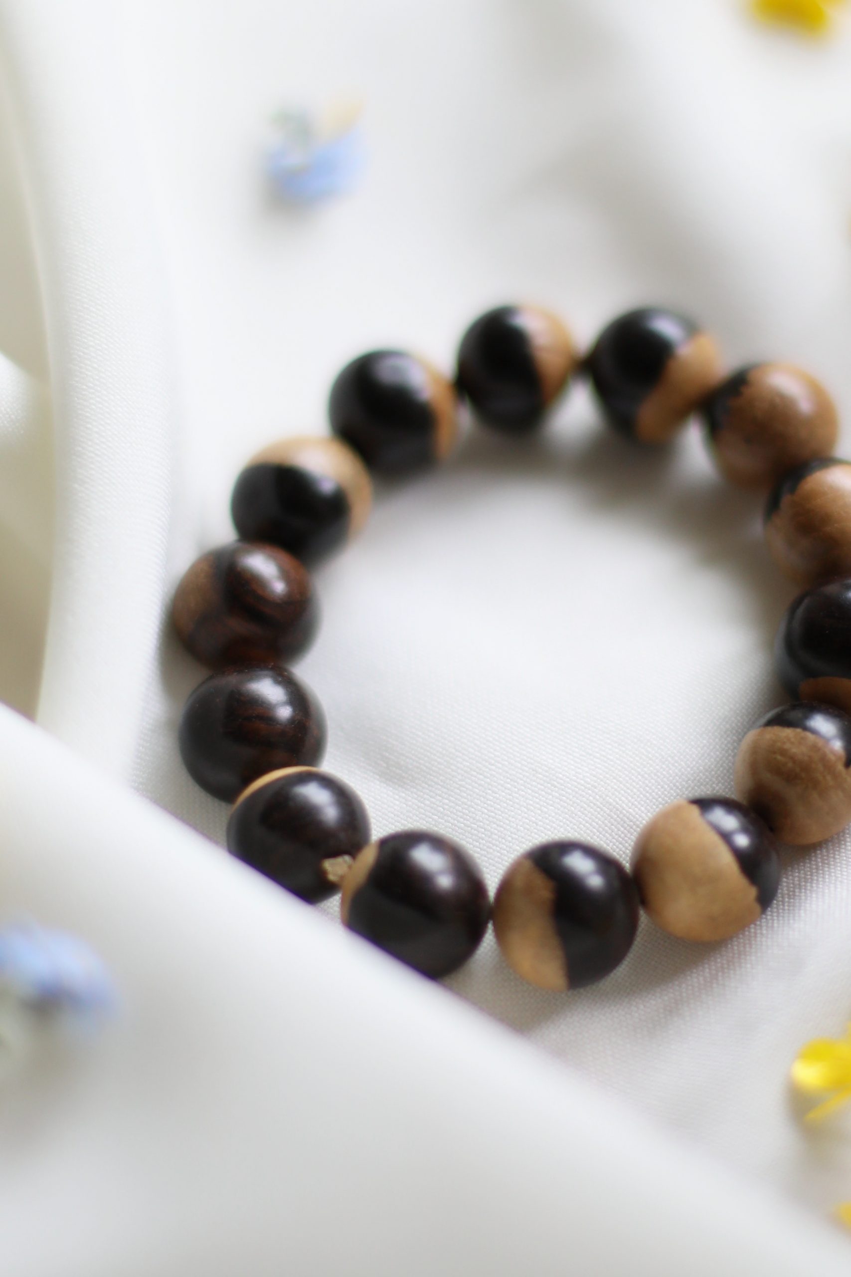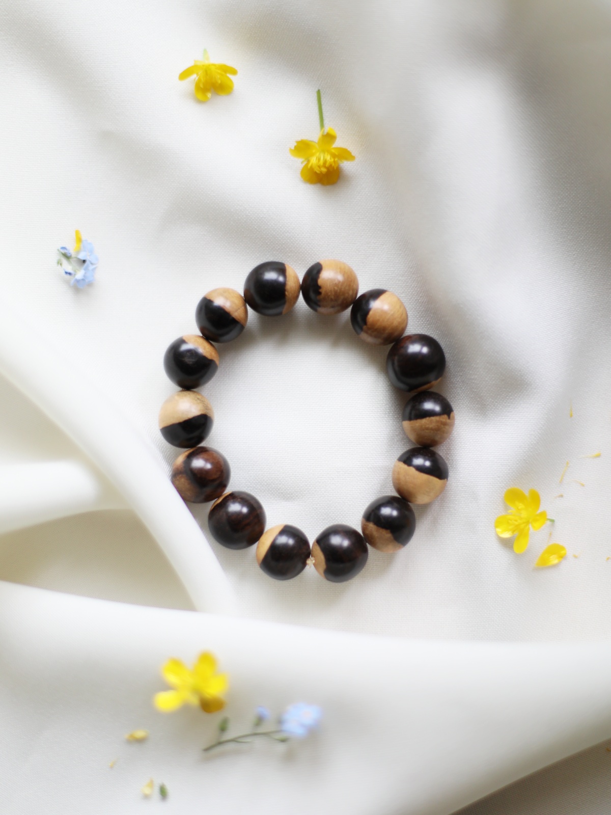 Ta piękna drewniana bransoletka pochodzi prosto z Zambii. Posiada dwa odcienie drewna co jest naturalnym efektem na każdym z oczek. Posiada elastyczną żyłkę dzięki której dopasuje się do każdej ręki.