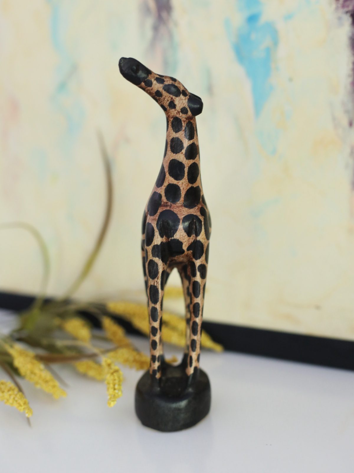 Ręcznie rzeźbiona żyrafa to świetny dodatek do każdego wnętrza.