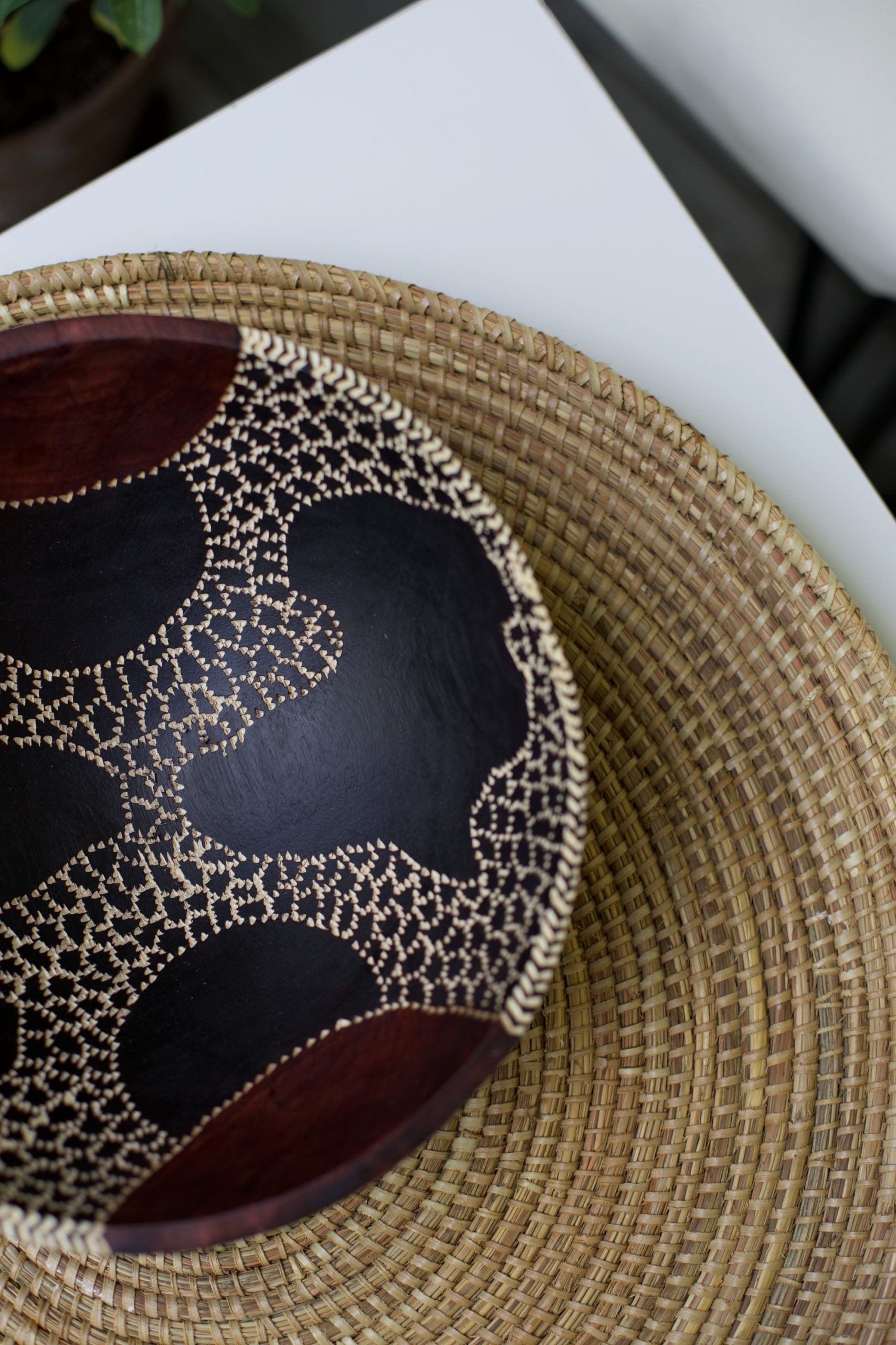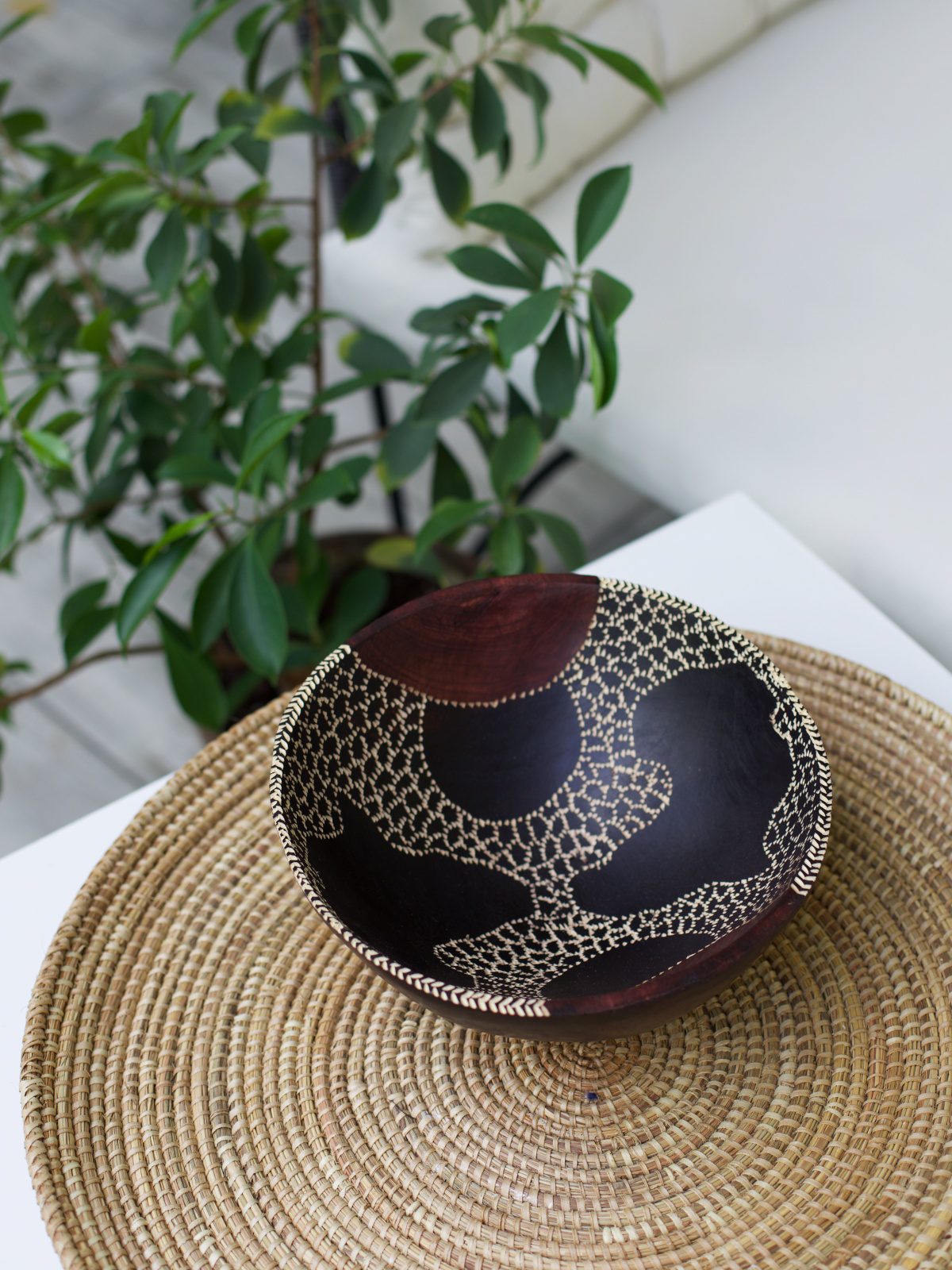 Piękna, ręcznie wykonana misa o unikalnym wzornictwie. Jej wewnętrzna powierzchnia zdobiona jest misternym, kontrastującym wzorem w odcieniach czerni i kremu, który dodaje jej wyjątkowego charakteru. Jest wykonana z wysokiej jakości materiałów, co gwarantuje jej trwałość i odporność na uszkodzenia. Idealnie sprawdzi się jako element dekoracyjny w każdym wnętrzu. Z pewnością przyciągnie uwagę każdego gościa.
