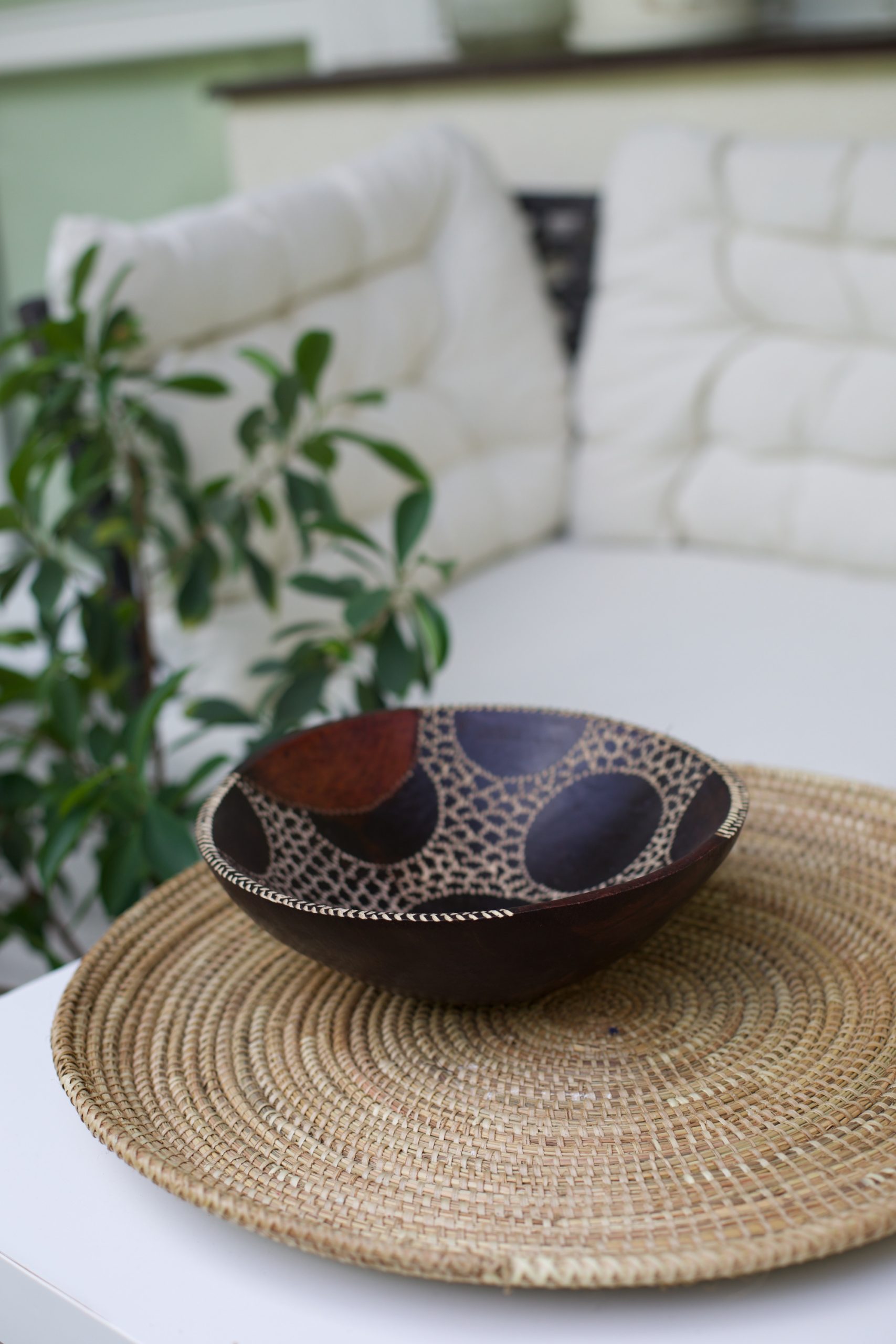 Piękna, ręcznie wykonana misa o unikalnym wzornictwie. Jej wewnętrzna powierzchnia zdobiona jest misternym, kontrastującym wzorem w odcieniach czerni i kremu, który dodaje jej wyjątkowego charakteru. Jest wykonana z wysokiej jakości materiałów, co gwarantuje jej trwałość i odporność na uszkodzenia. Idealnie sprawdzi się jako element dekoracyjny w każdym wnętrzu. Z pewnością przyciągnie uwagę każdego gościa.