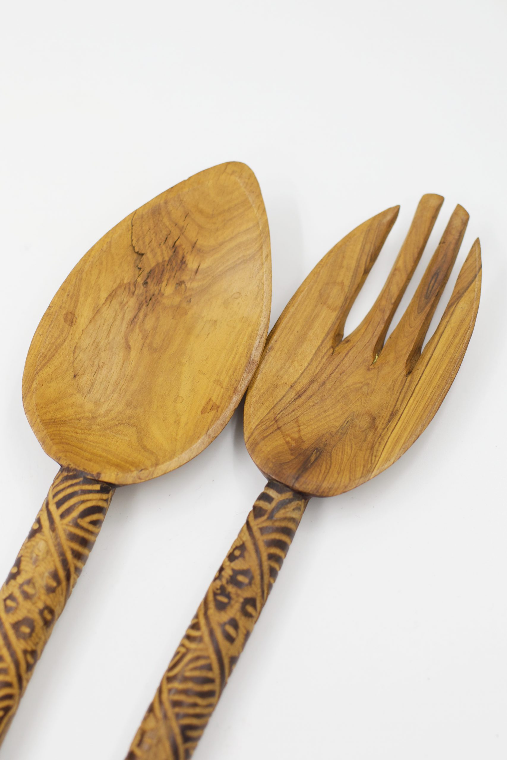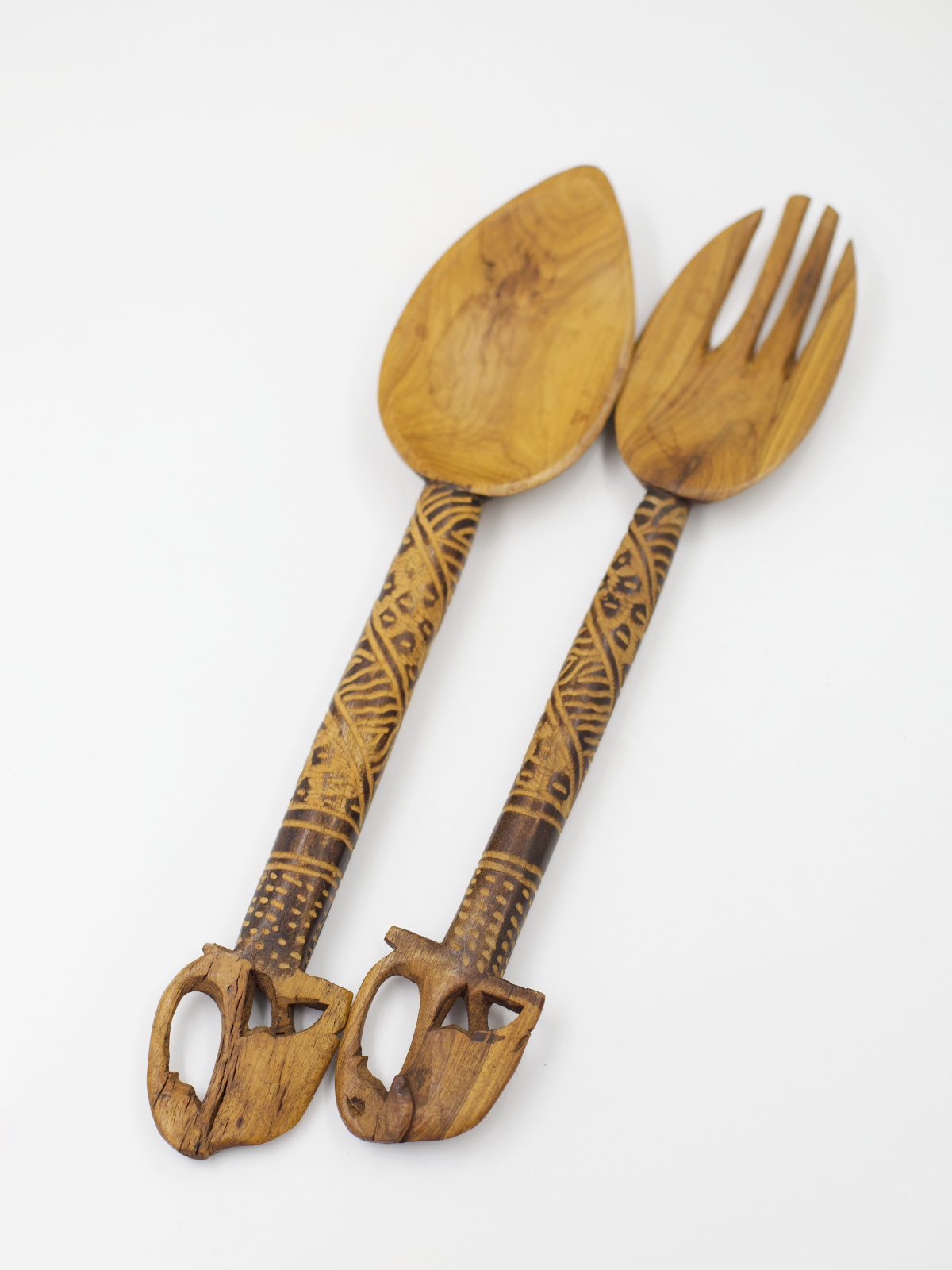 Drewniane sztućce zostały wykonane ręcznie przez zambijskiego artystę. Idealne do serwowania sałatek. Motyw zwierzęcy nadaje im oryginalności.