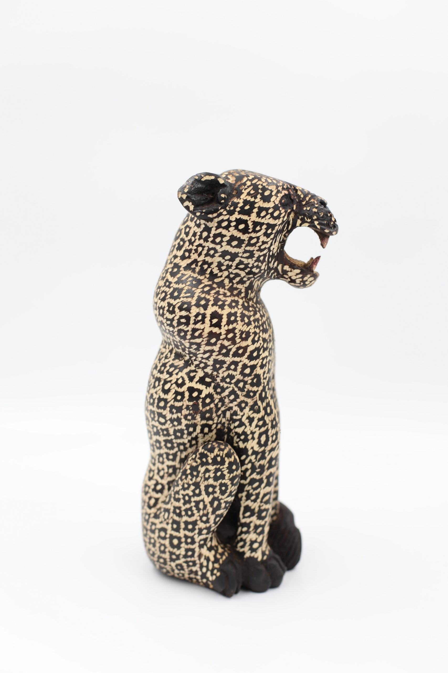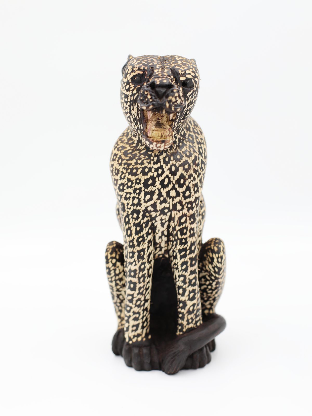 Ręcznie rzeźbiony lampart wykonany z jednego kawałka drewna. Świetna, nowoczesna figura, która doda charakteru w Twoim wnętrzu.