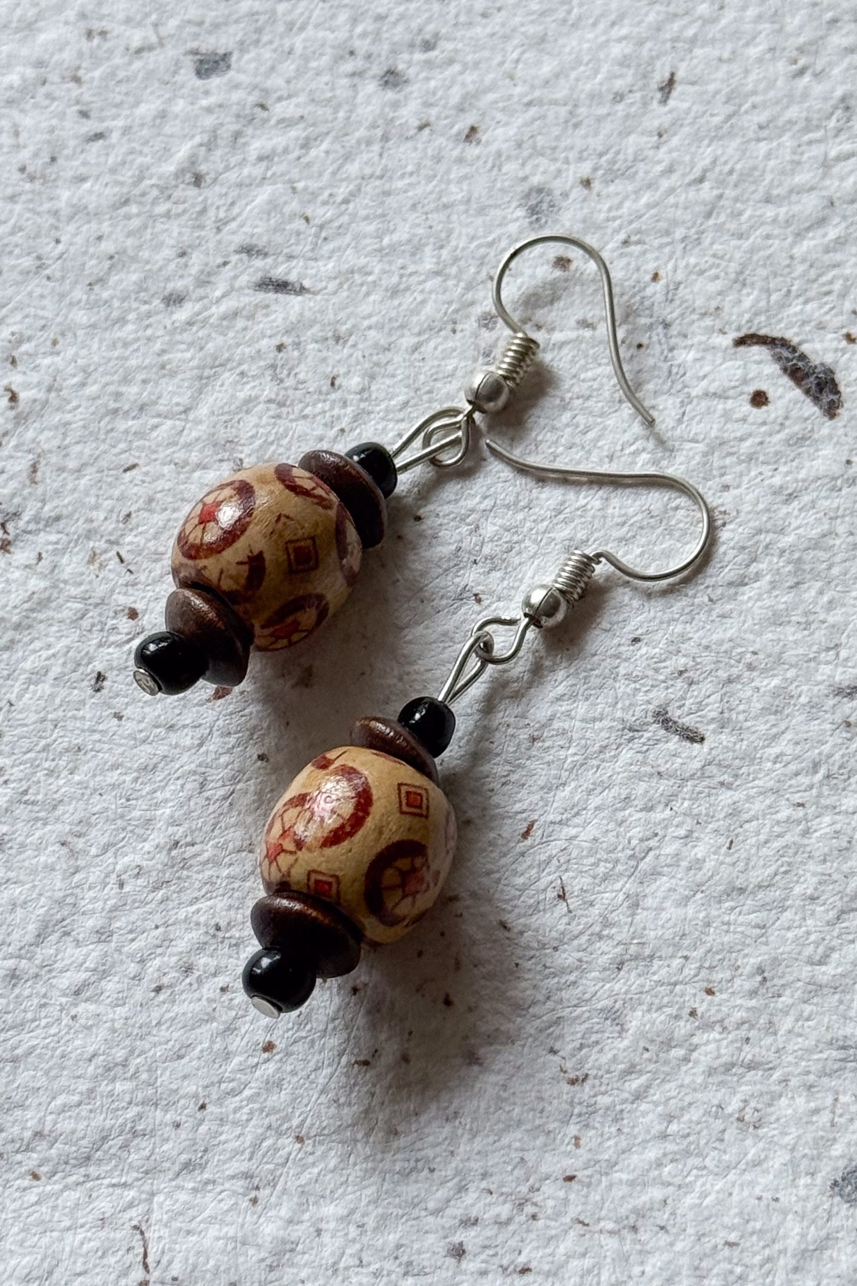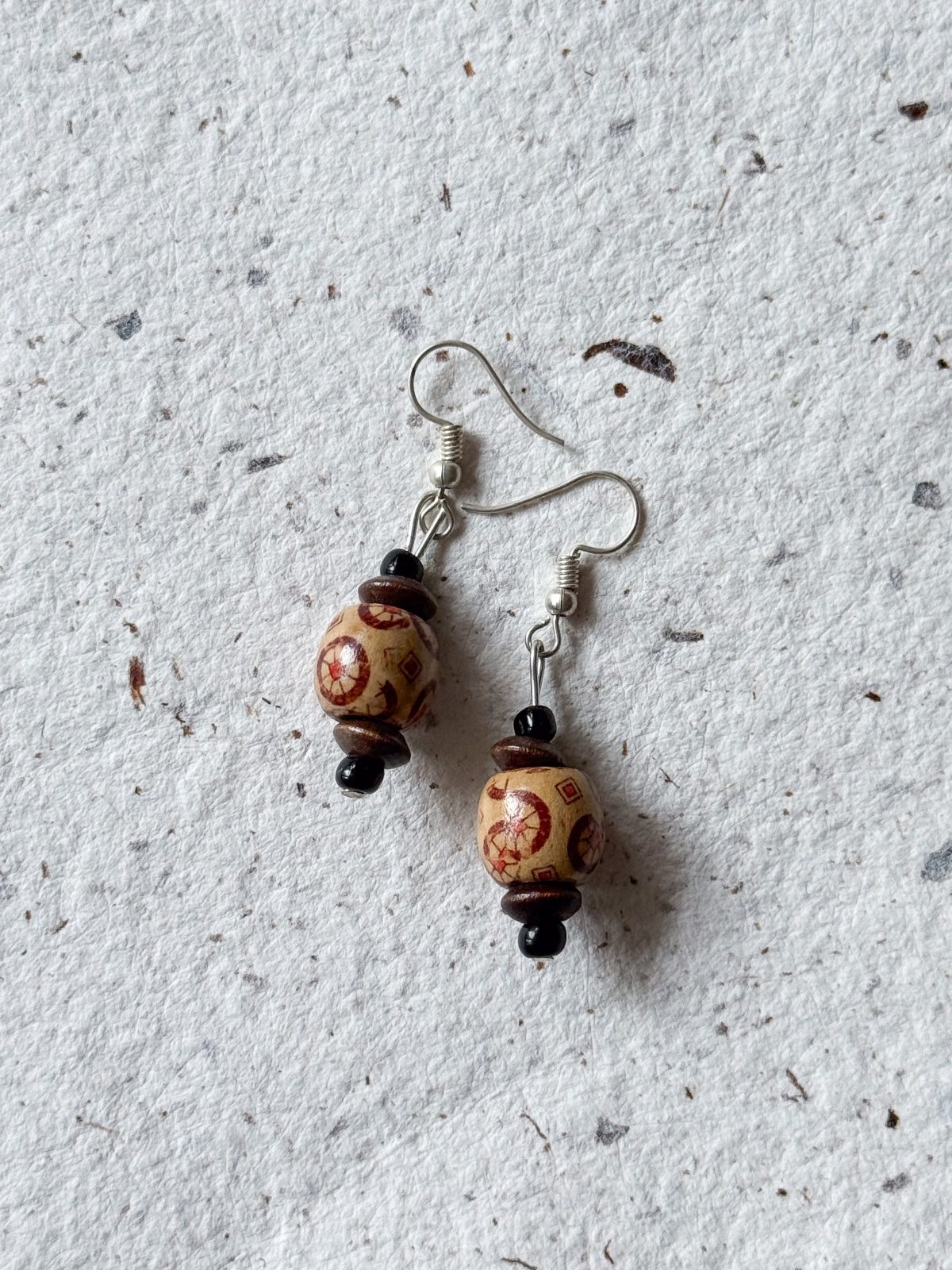 Lekkie kolczyki z ozdobnych, toczonych drewnianych koralików, zdobionych delikatnym, kwiatowym wzorem w odcieniach czerwieni i brązu. Naturalna faktura drewna nadaje im ciepły, etniczny charakter, a ciemne, kontrastowe akcenty dodają im wyrazistości. Każdy koralik różni się subtelnie od pozostałych, dzięki czemu każda para jest jedyna w swoim rodzaju. Srebrne bigle sprawiają, że kolczyki są wygodne i lekkie – idealne do codziennych, naturalnych stylizacji.