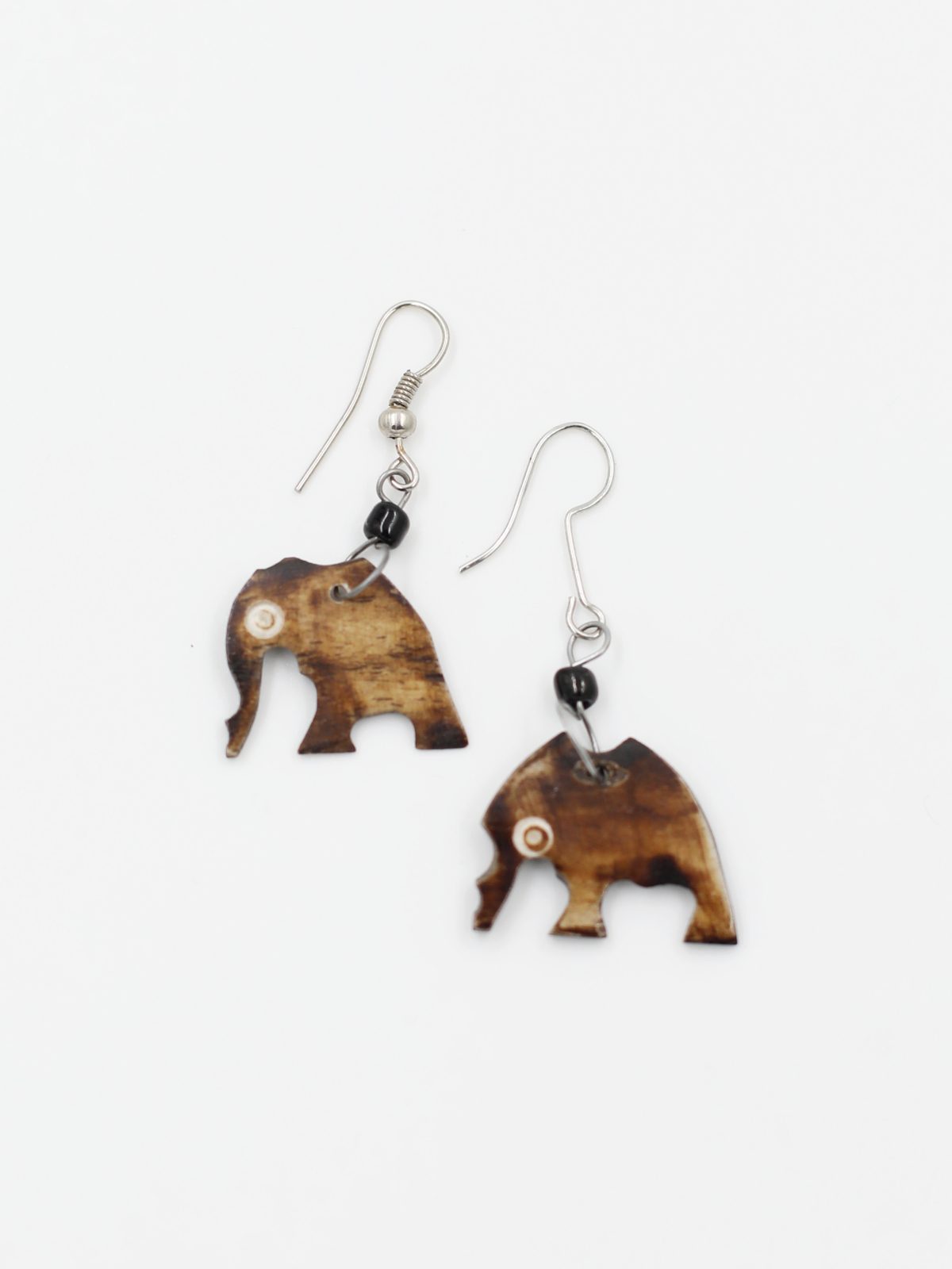 Drewniane kolczyki ręcznie rzeźbione w kształcie przynoszących szczęście słoni. Przywiezione zostały z Rwandy, z jednej z naszych podróży gdzie odwiedzaliśmy Hospicjum.