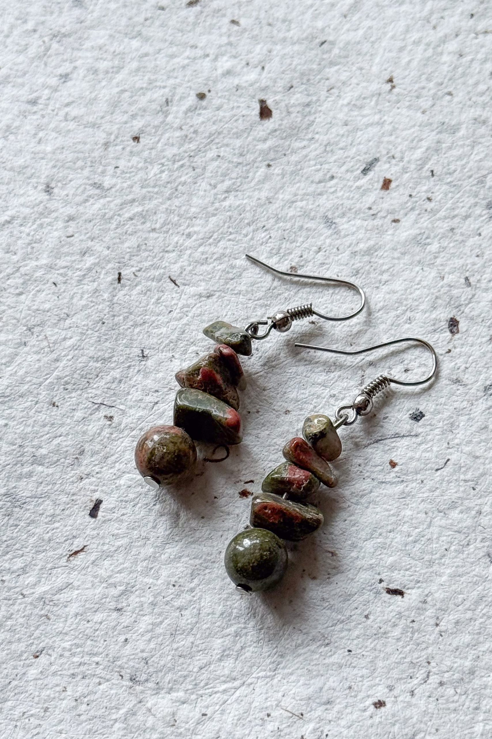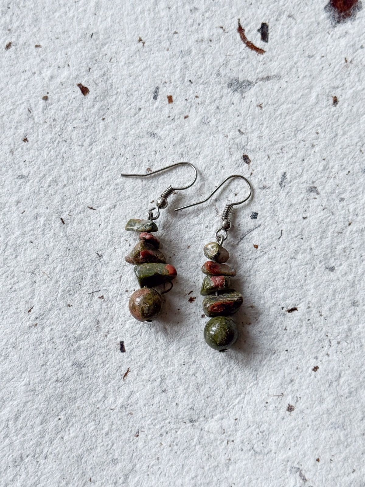 Delikatne kolczyki wykonane z drobnych kamieni o ziemistych odcieniach zieleni, brązu i subtelnych, ceglastych akcentów. Połączenie nieregularnych, surowych bryłek z gładkimi, kulistymi koralikami tworzy minimalistyczną, a jednocześnie etniczną kompozycję. Każdy element ma swoje unikatowe wybarwienie, dlatego każda para jest niepowtarzalna. Lekkie, srebrne bigle sprawiają, że kolczyki świetnie uzupełnią codzienne stylizacje oraz proste, naturalne zestawy boho.