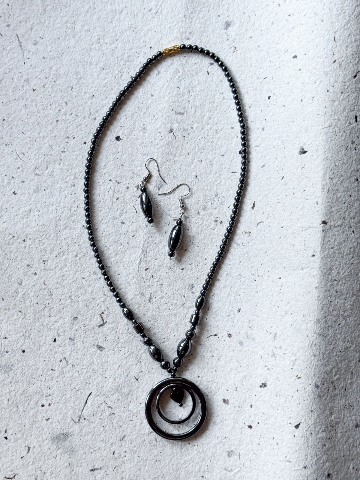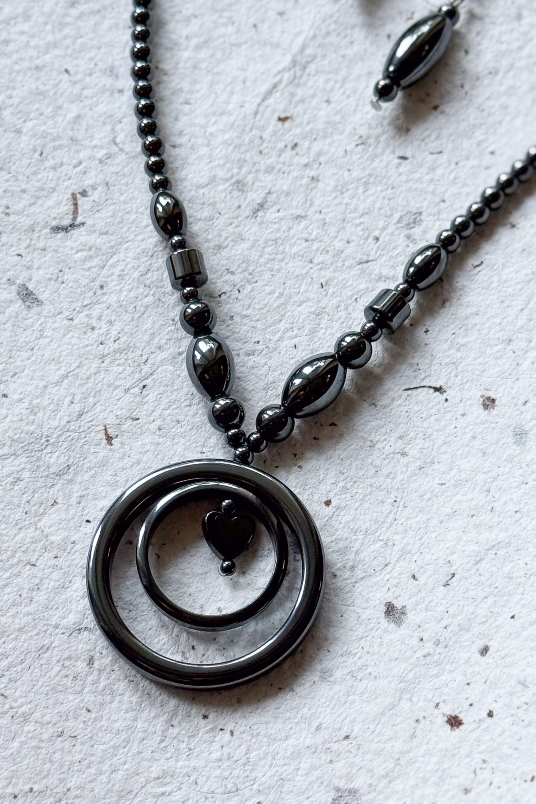 Komplet biżuterii wykonany z hematytu o charakterystycznym, grafitowym połysku. Naszyjnik zbudowany jest z drobnych koralików przełamanych większymi, podłużnymi elementami, które prowadzą do podwójnej okrągłej zawieszki. W centrum mniejszego okręgu znajduje się delikatne serduszko – subtelny detal dodający naszyjnikowi lekkości.