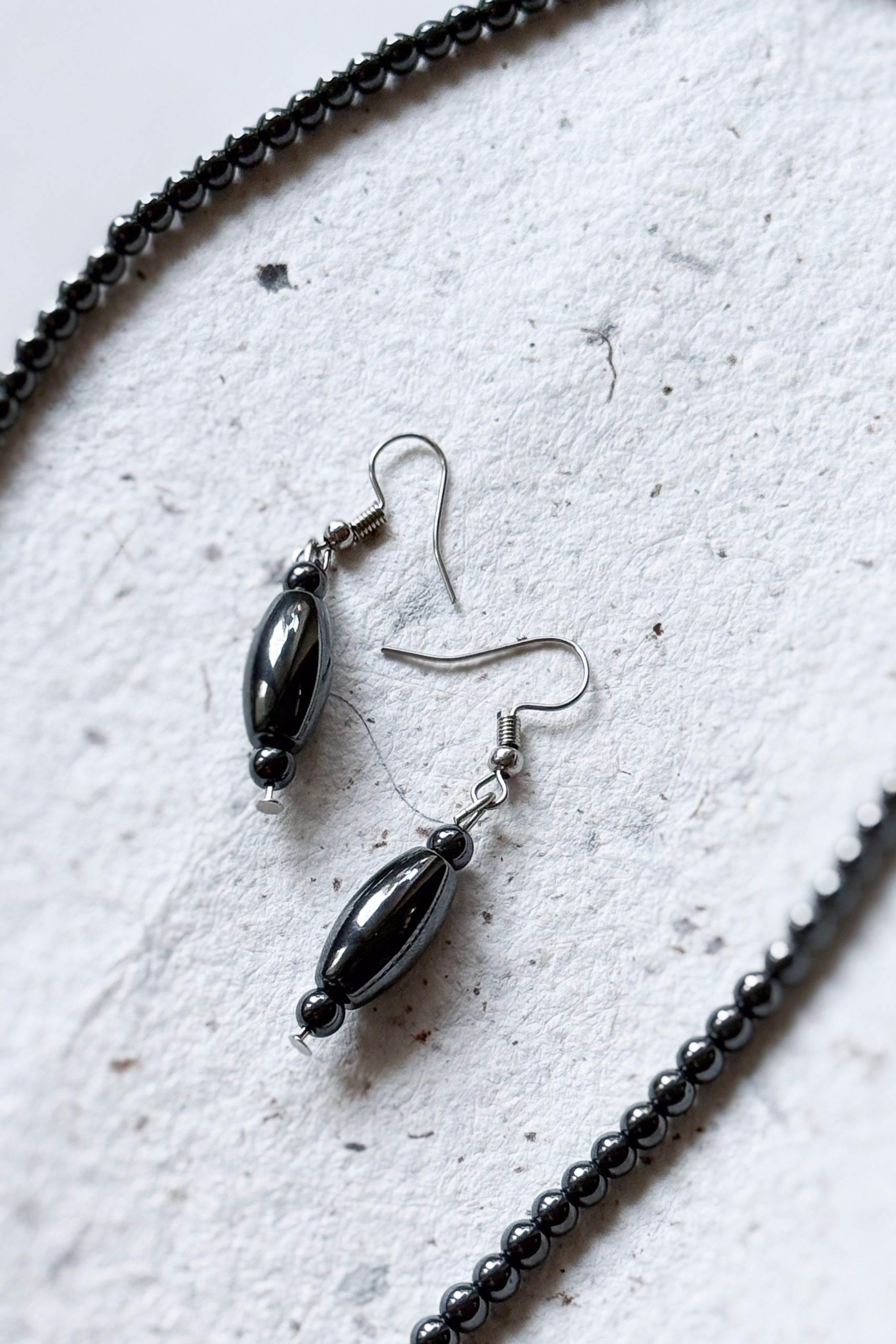 Kolczyki mają smukłą, wydłużoną formę z dopasowanych hematytowych koralików, dzięki czemu tworzą spójny, minimalistyczny zestaw z naszyjnikiem. Komplet jest elegancki i jednocześnie bardzo uniwersalny – sprawdzi się zarówno do codziennych stylizacji, jak i bardziej wyjściowych.