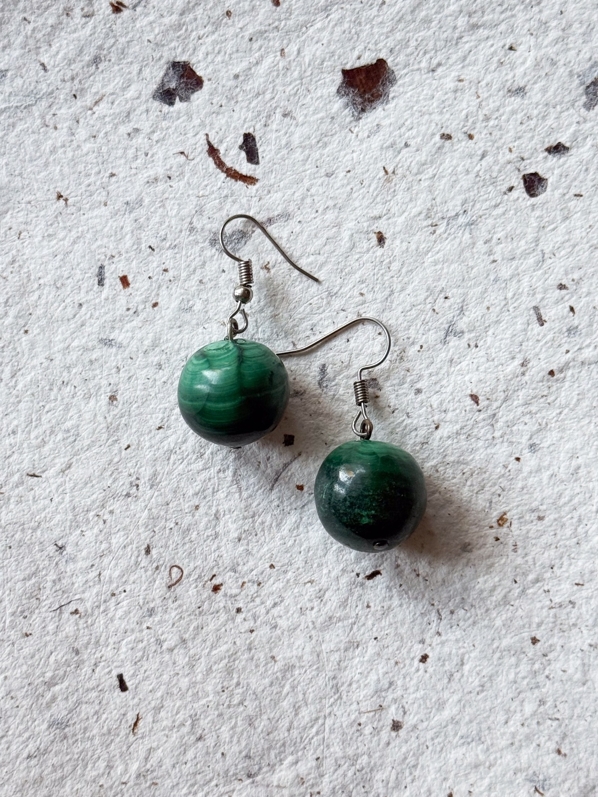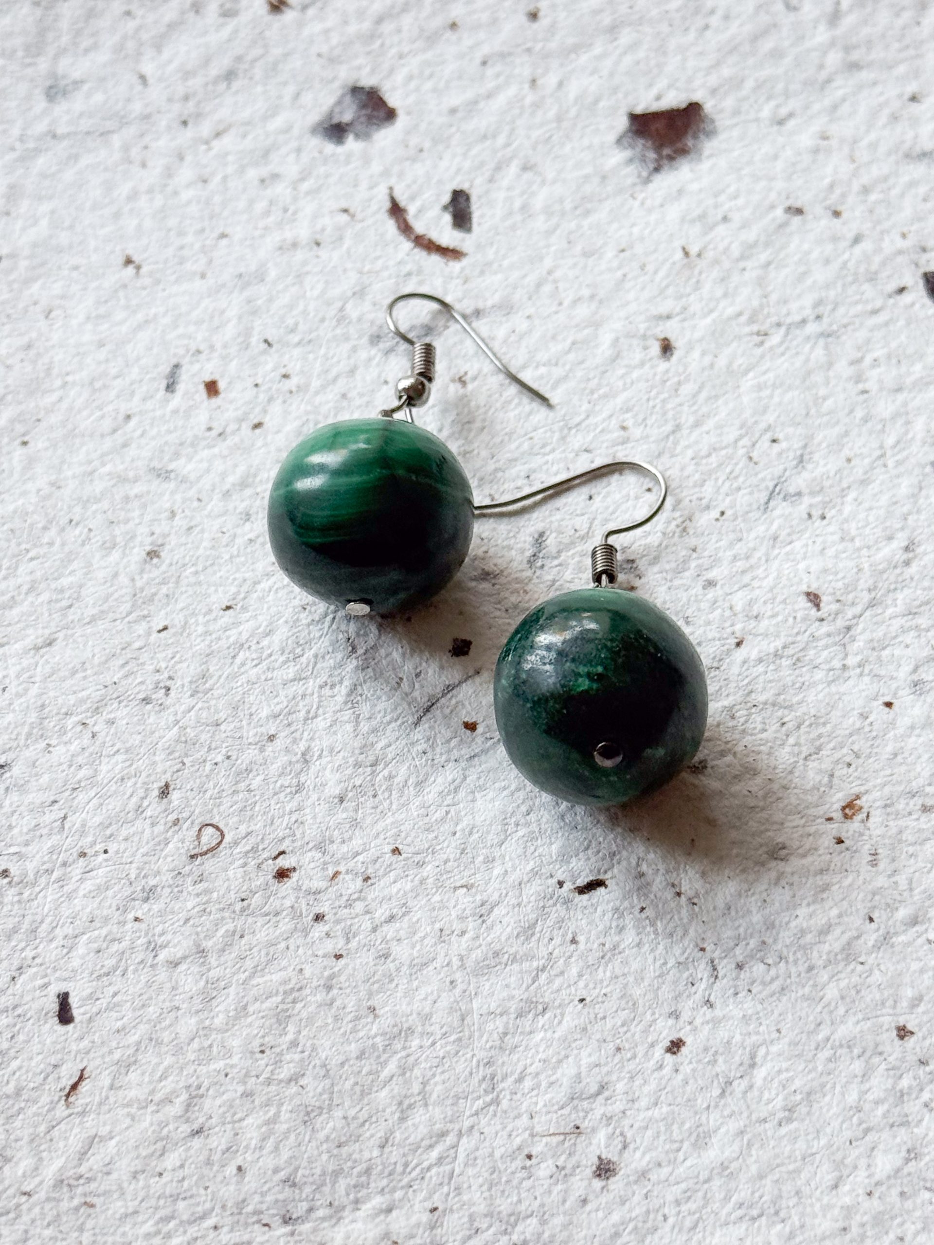 Kolczyki wykonane z naturalnego malachitu, kamienia rozpoznawalnego po głębokiej zieleni i dekoracyjnych, nieregularnych pasmach. Gładkie, kuliste koraliki podkreślają organiczny rysunek minerału, dzięki czemu każdy egzemplarz ma własny, niepowtarzalny układ smug.