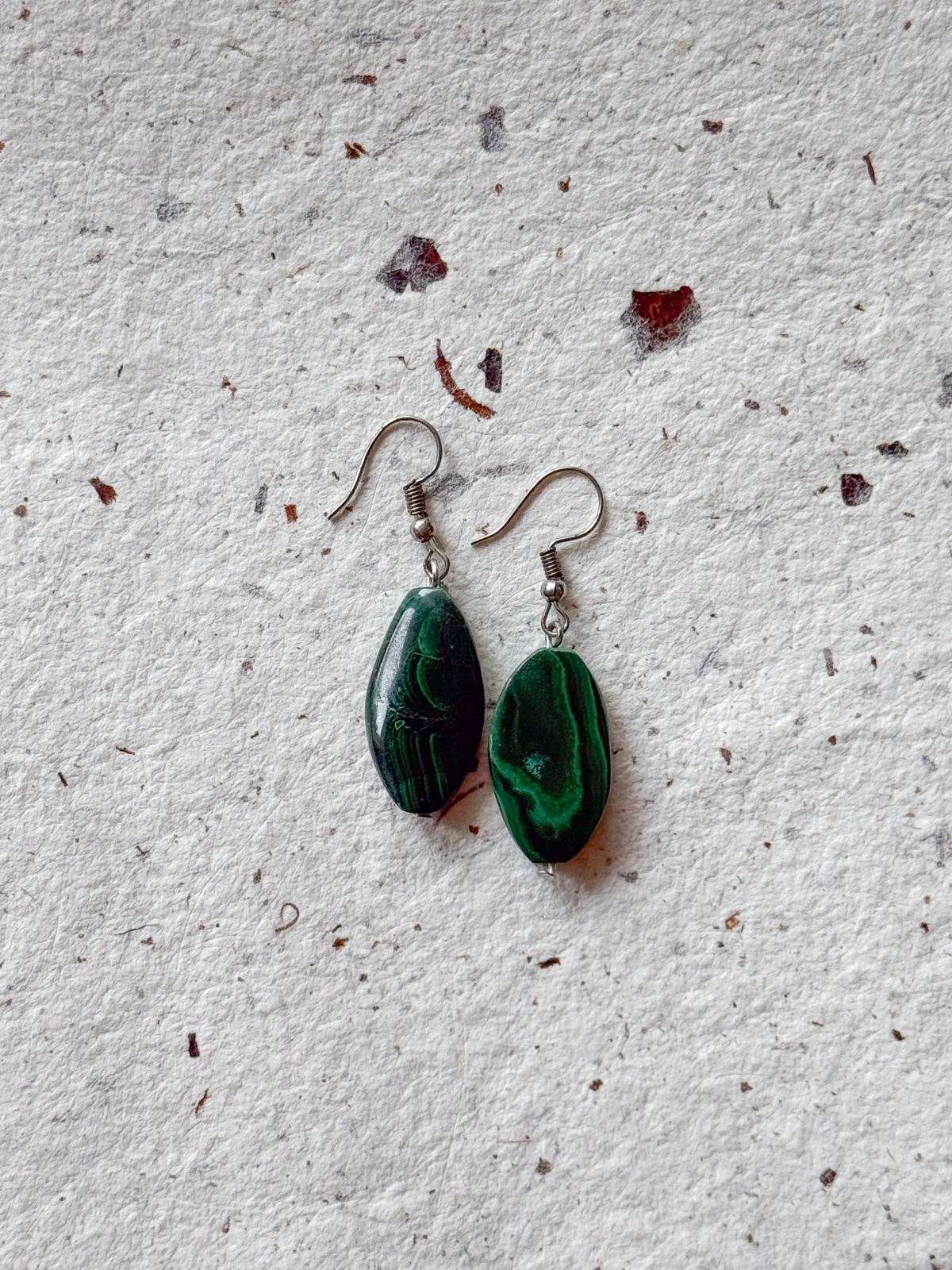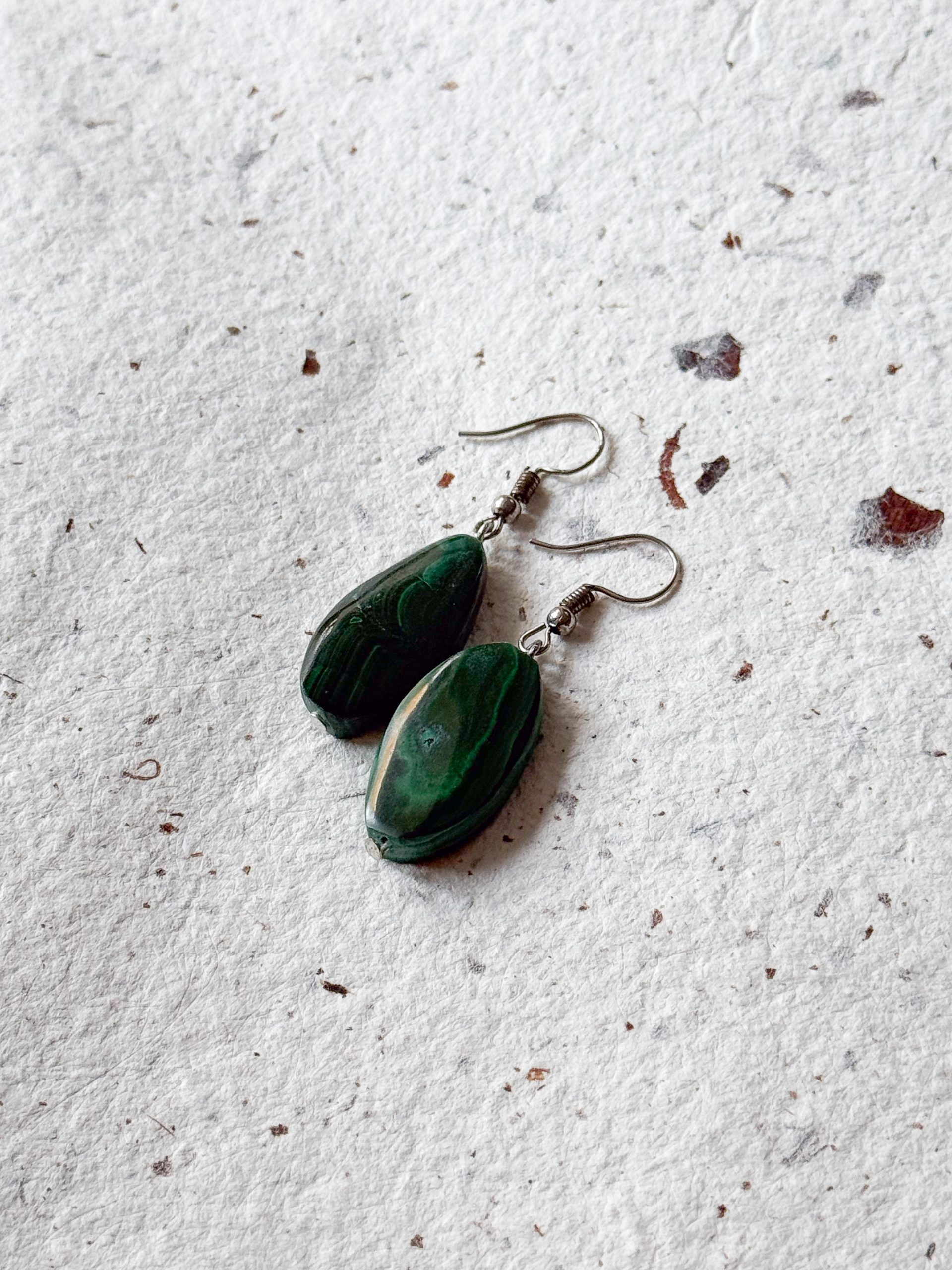 Kolczyki wykonane z naturalnego malachitu w podłużnym, lekko nieregularnym kształcie. Głęboka zieleń kamienia przeplata się z charakterystycznymi, falistymi smugami, dzięki czemu każdy element ma własny, niepowtarzalny rysunek. Podłużna forma wysmukla linię i dodaje kolczykom delikatnego, eleganckiego charakteru.