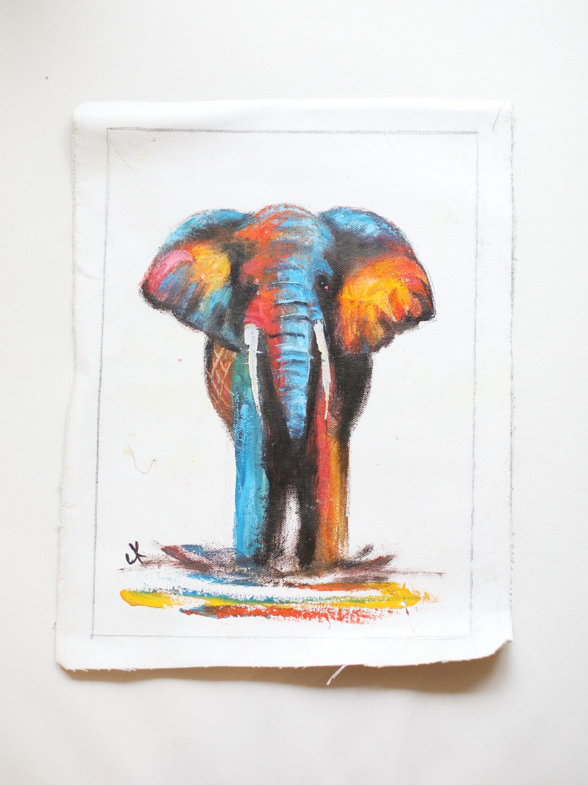Obraz namalowany na płótnie przez lokalnego, zambijskiego artystę. Przedstawia dużego kolorowego słonia. Obraz można oprawić w ramę lub naciągnąć na bejtram.