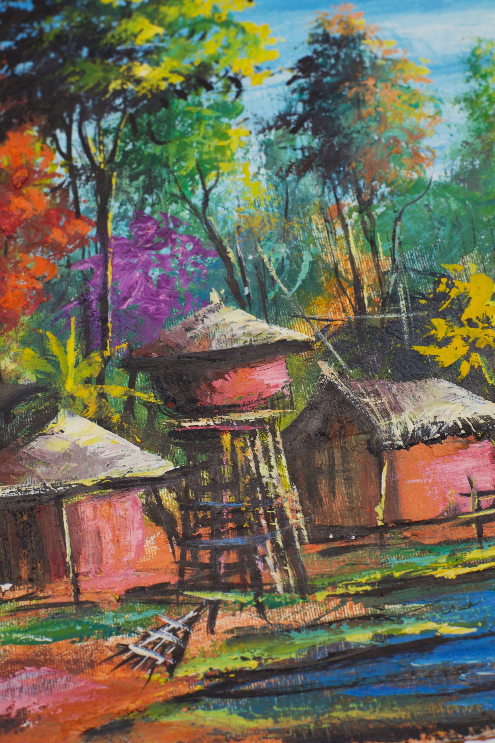 Ręcznie malowany obraz przedstawiający scenę z życia wioski, utrzymany w intensywnej, wielobarwnej palecie. To propozycja idealna do współczesnych wnętrz, w których coraz częściej pojawiają się kolor, sztuka i wyraziste, designerskie akcenty. Obraz wnosi do przestrzeni energię, ciepło i lekko artystyczny charakter, przełamując neutralne aranżacje.