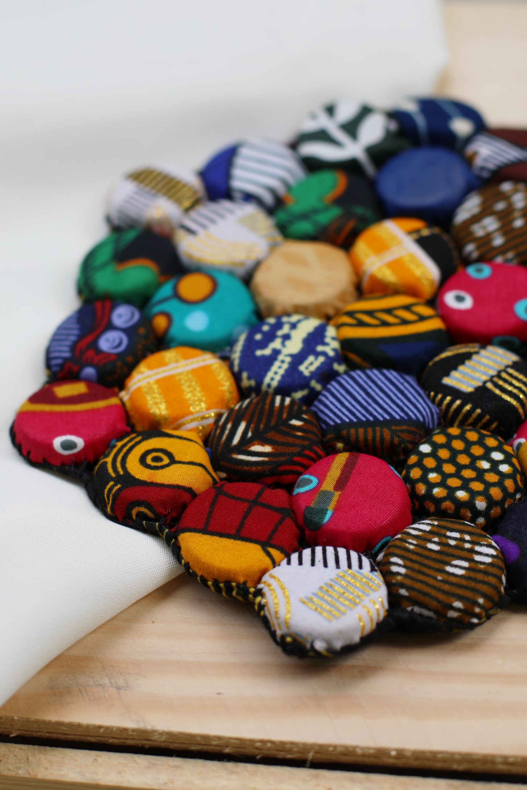 Oryginalna podkładka wykonana ręcznie z kapsli i batiku. Świetnie sprawdzi się jako ozdoba do kuchni lub salonu. Przywieziona od senegalskiego rękodzielnika.