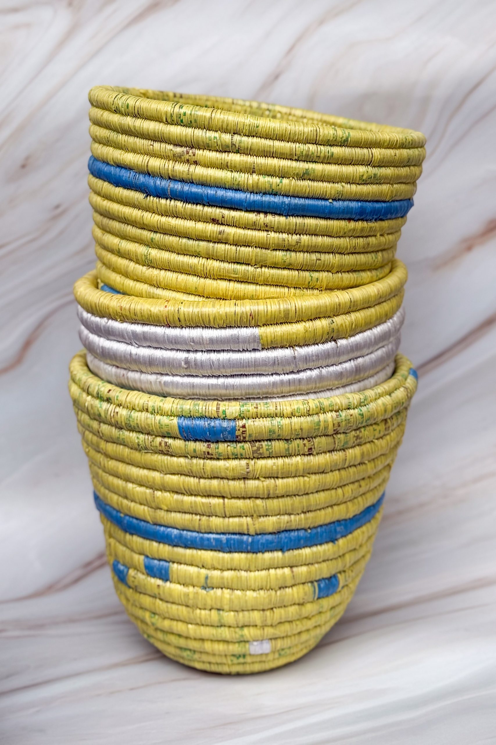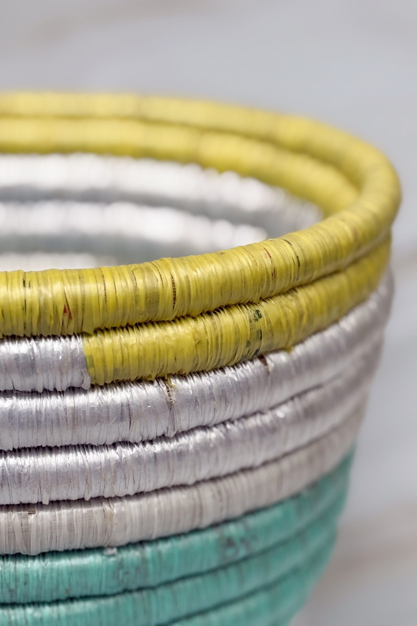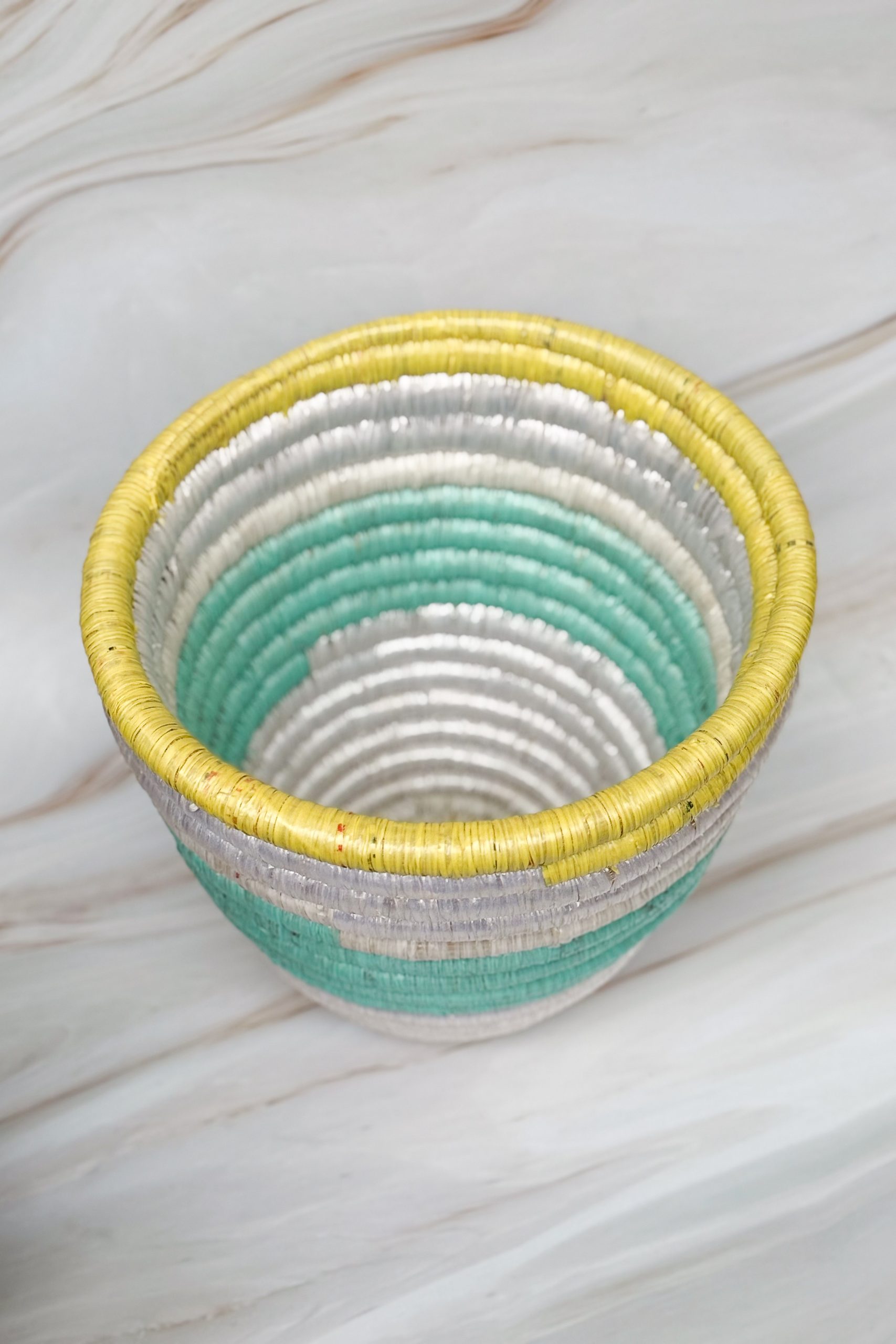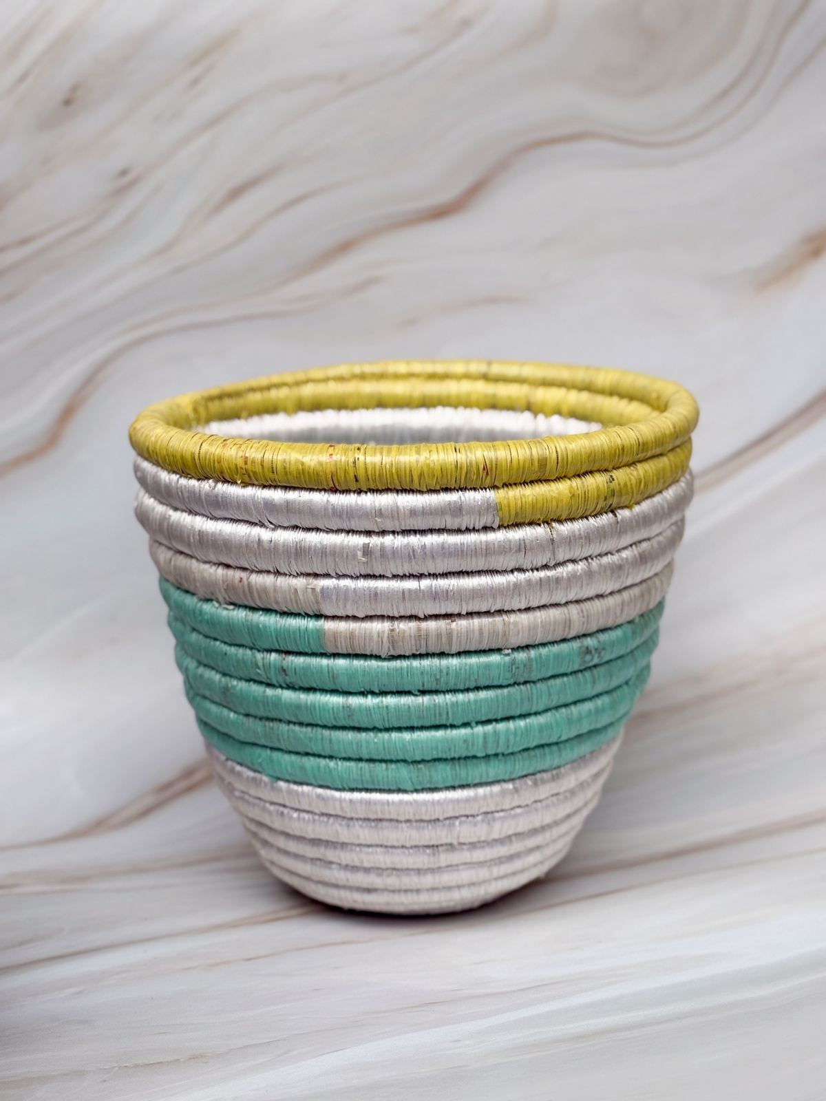 Pojemnik upleciono z lokalnej trawy w stonowanych odcieniach bieli, jasnej żółci i delikatnej zieleni, tworzących spokojną, harmonijną kompozycję. Jest lekki, solidny i ma naturalną fakturę typową dla ręcznego rzemiosła. Może służyć do przechowywania drobiazgów, a także jako dekoracja albo osłonka na doniczkę.