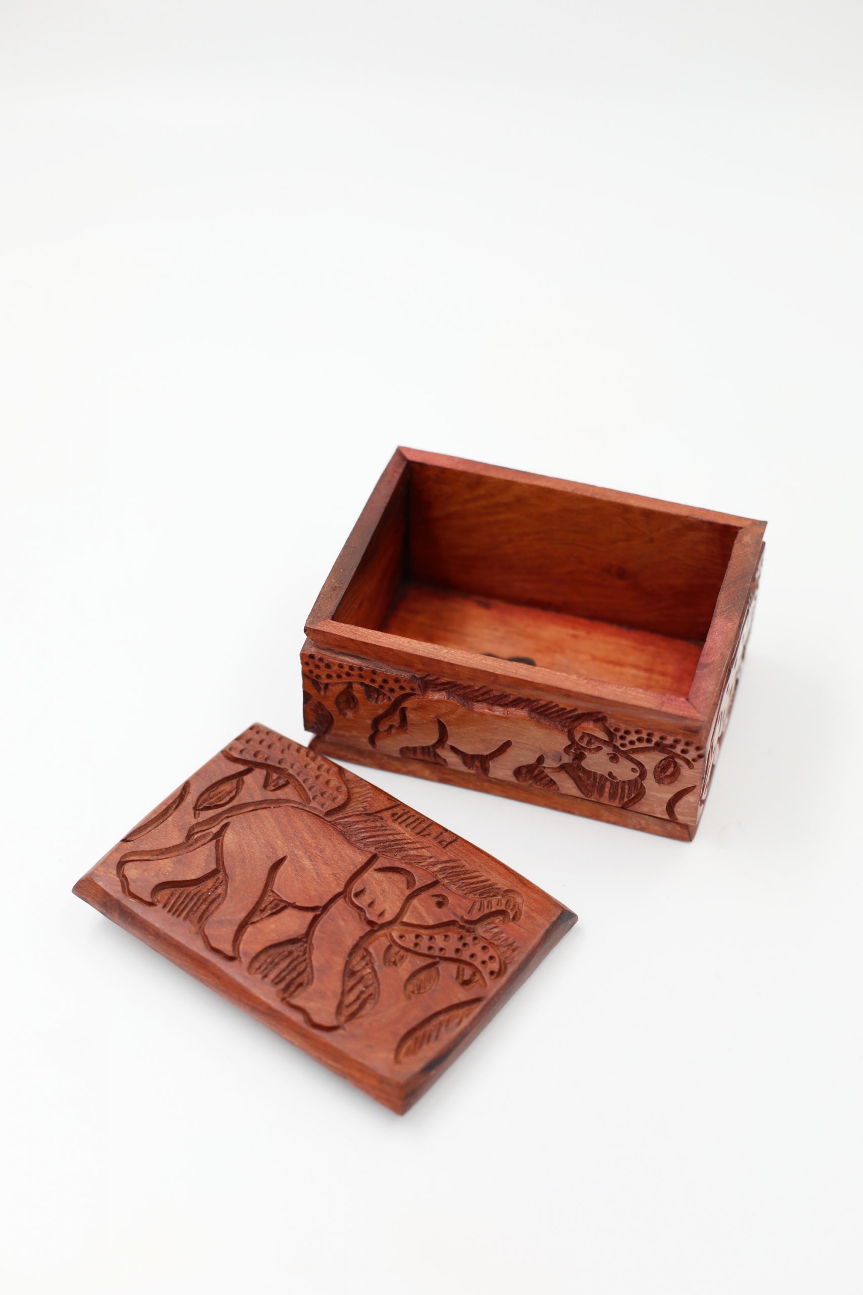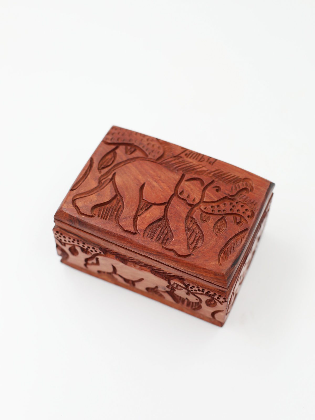 Ten drewniany pojemnik będzie idealny do przechowywania biżuterii. Na jego ściankach widnieją rzeźbione afrykańskie zwierzęta.