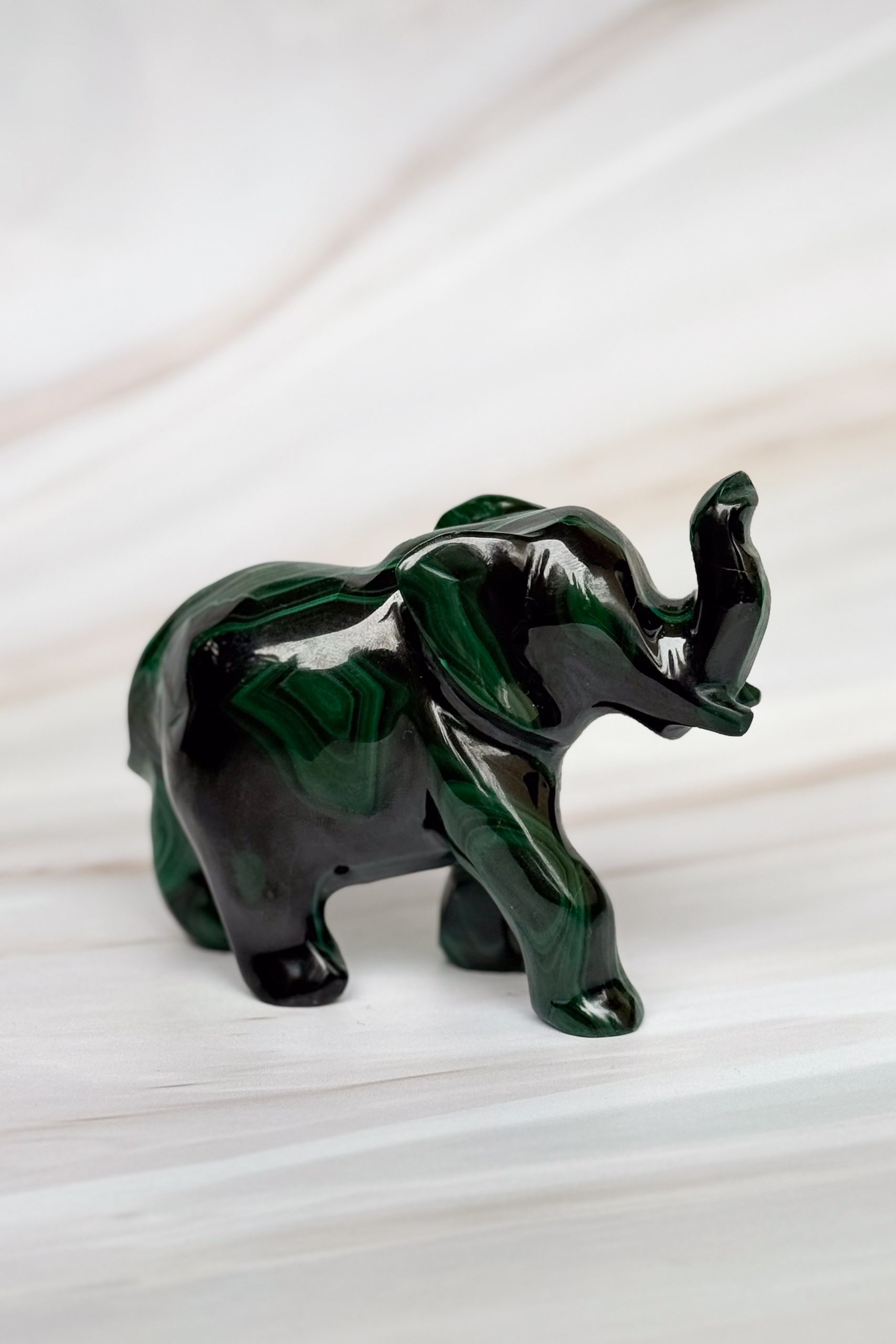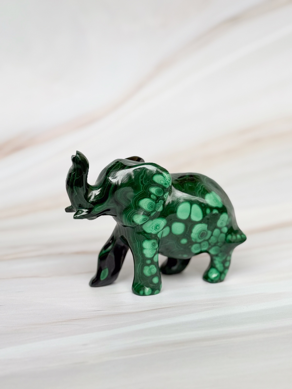 Ręcznie rzeźbiona figurka słonia wykonana z naturalnego malachitu o intensywnej, zielonej barwie. Na powierzchni kamienia układają się charakterystyczne, miękko przechodzące odcienie, które nadają każdemu egzemplarzowi niepowtarzalny wygląd. Delikatnie wyprofilowana sylwetka podkreśla dostojność zwierzęcia, a gładkie wykończenie wydobywa elegancję i naturalny połysk minerału. To subtelna dekoracja o wyrazistej formie, która wprowadza do wnętrza szlachetność afrykańskiego kamienia.