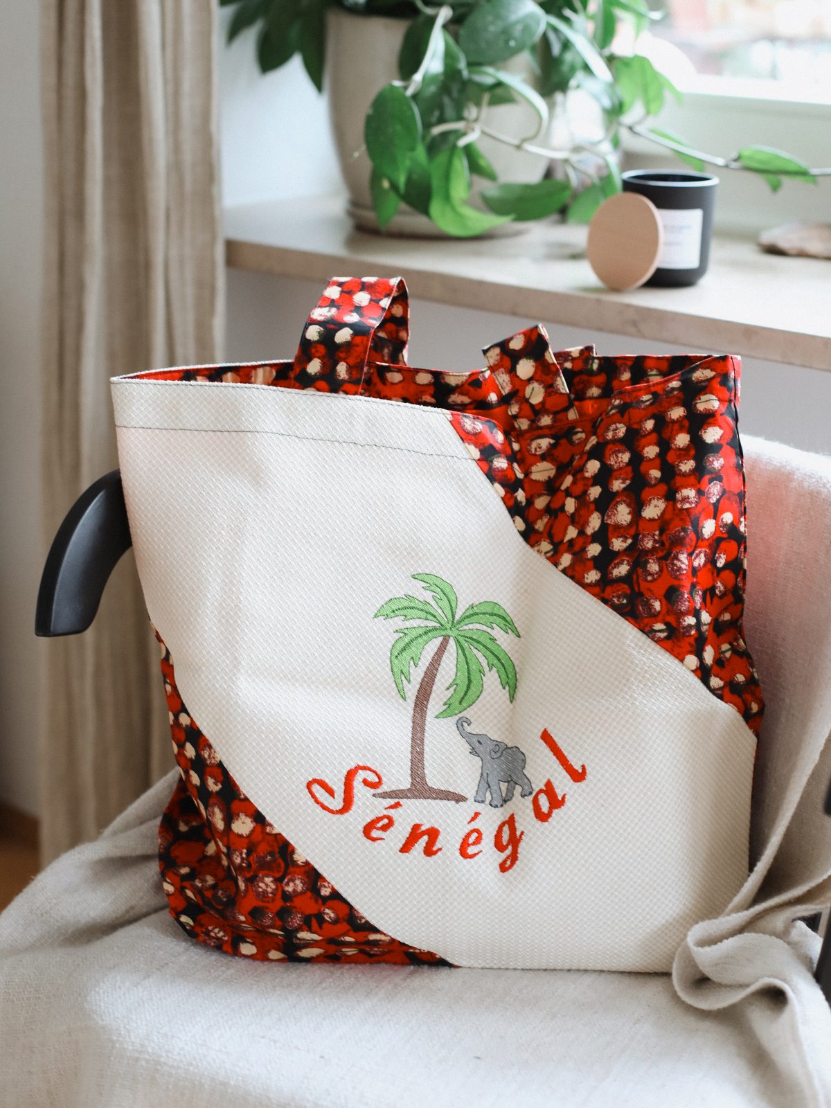 Wyjątkowa torba w odcieniu beżu, ozdobiona haftem przedstawiającym palmę, słonia oraz napis „Sénégal”. Połączenie subtelnego haftu z ręcznie barwionym batikiem w ciepłych odcieniach czerwieni i czerni sprawia, że torba wyróżnia się oryginalnością i niepowtarzalnym charakterem. Starannie uszyta w Senegalu przez uczennicę szkoły zawodowej Foyer Maria Goretti, torba jest trwała i praktyczna – idealna na zakupy lub jako stylowy dodatek na co dzień. Wewnątrz znajduje się zamykana na zamek błyskawiczny kieszonka, która ułatwia przechowywanie najpotrzebniejszych rzeczy.