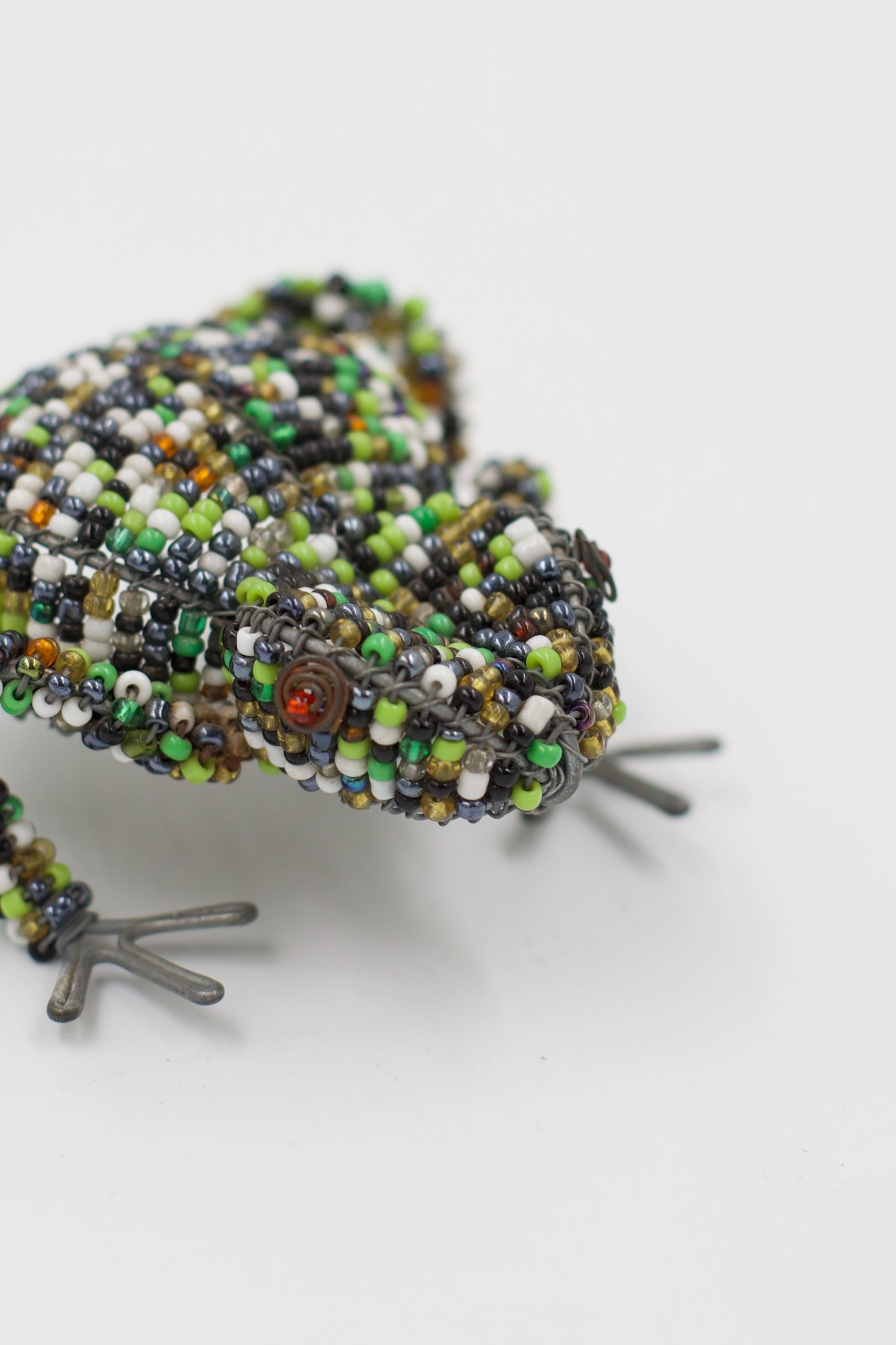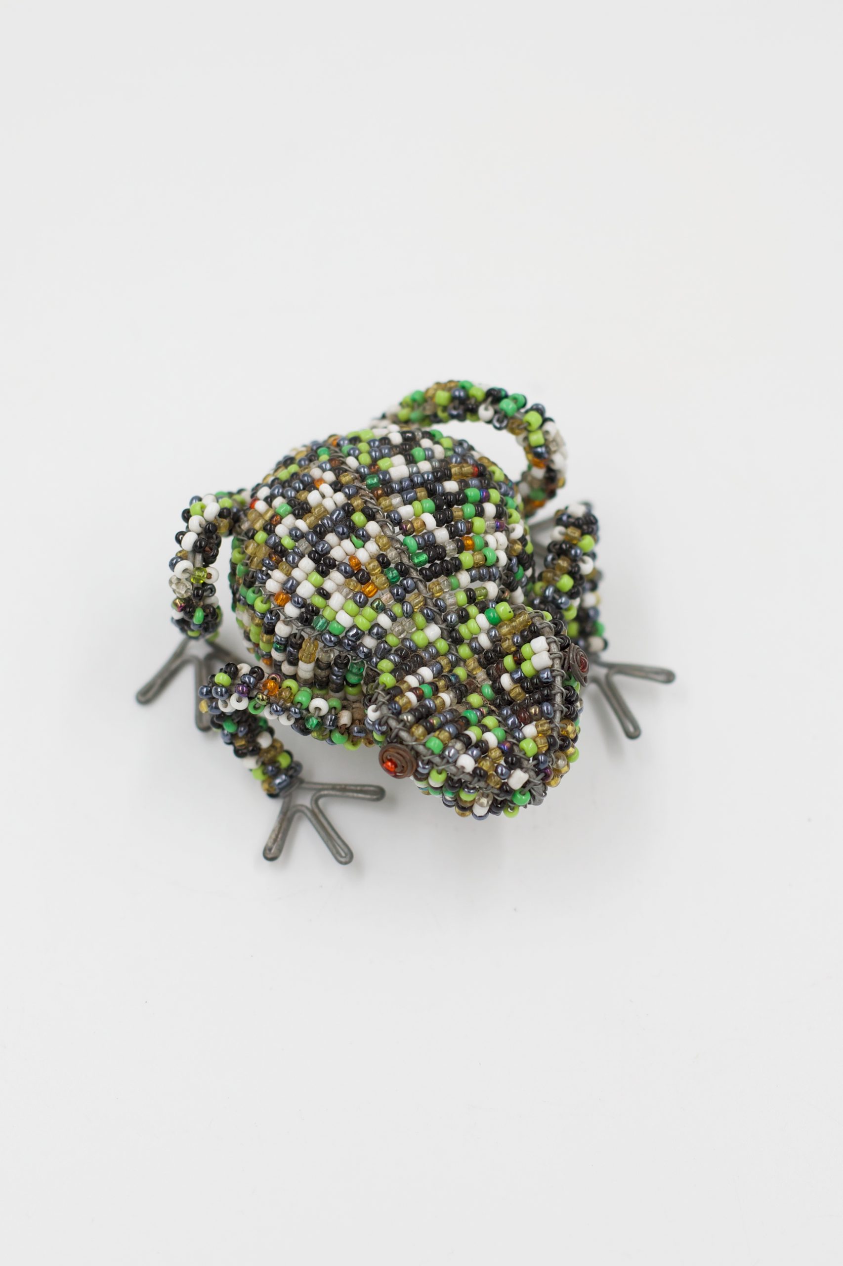 Ta figurka żaby została wykonana z materiałów z recyklingu. Ozdobiona kolorowymi koralikami. Jest to ozdoba zdecydowanie oryginalna i pomysłowa.