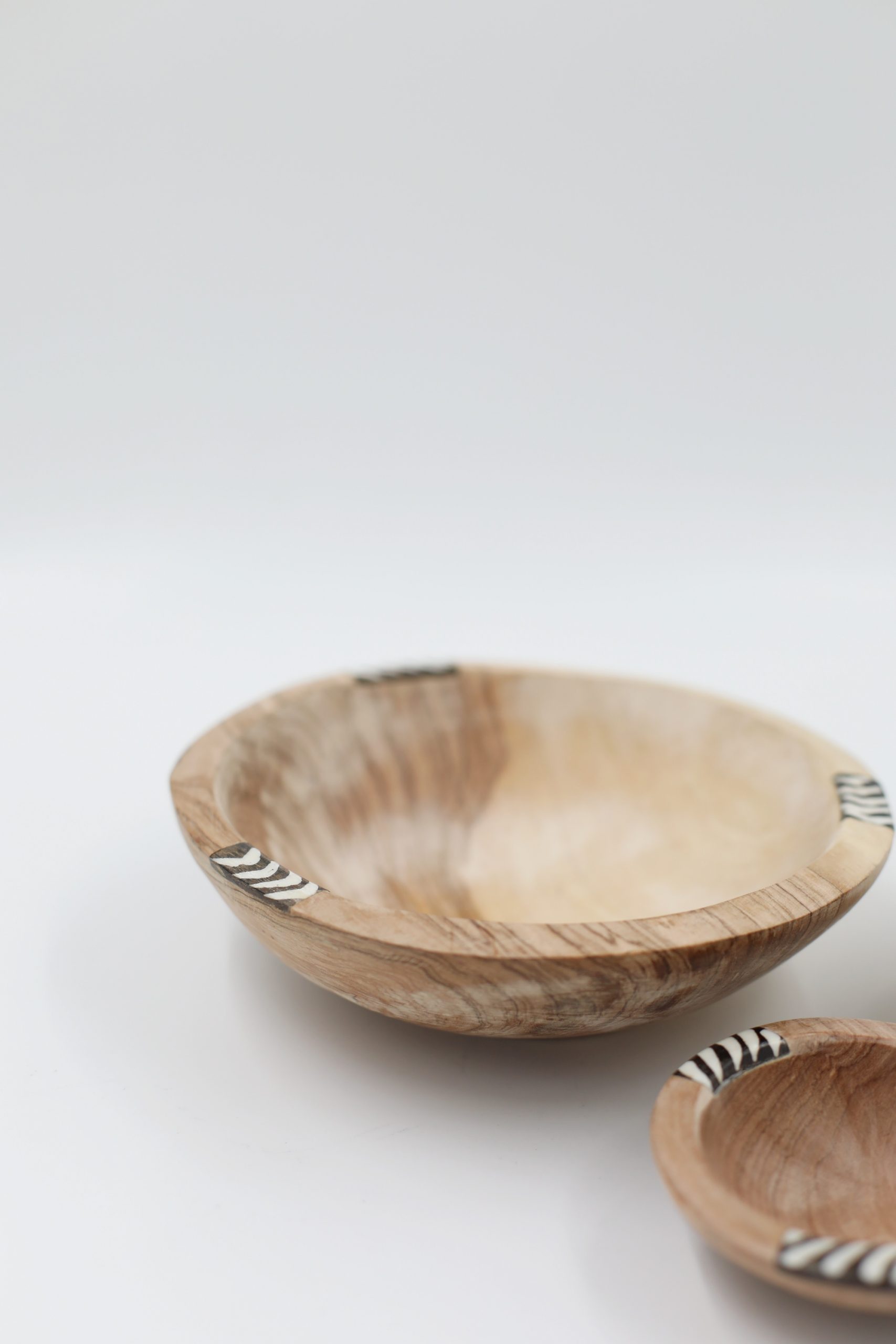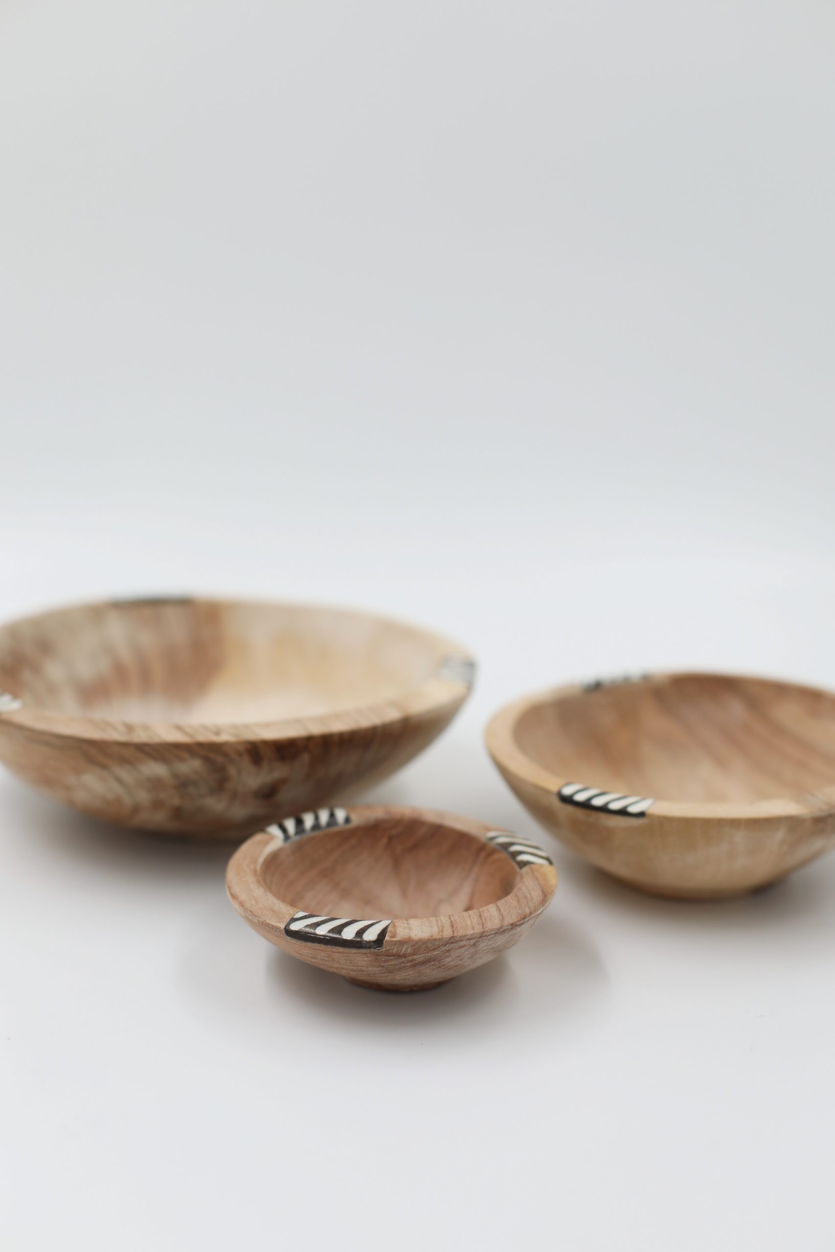 Piękny zestaw trzech miseczek z jasnego drewna. Posiada wstawki w motywie zebry. Idealne do serwowania suchych produktów lub do przechowywania drobiazgów. Idealne również po prostu jako dekoracja.