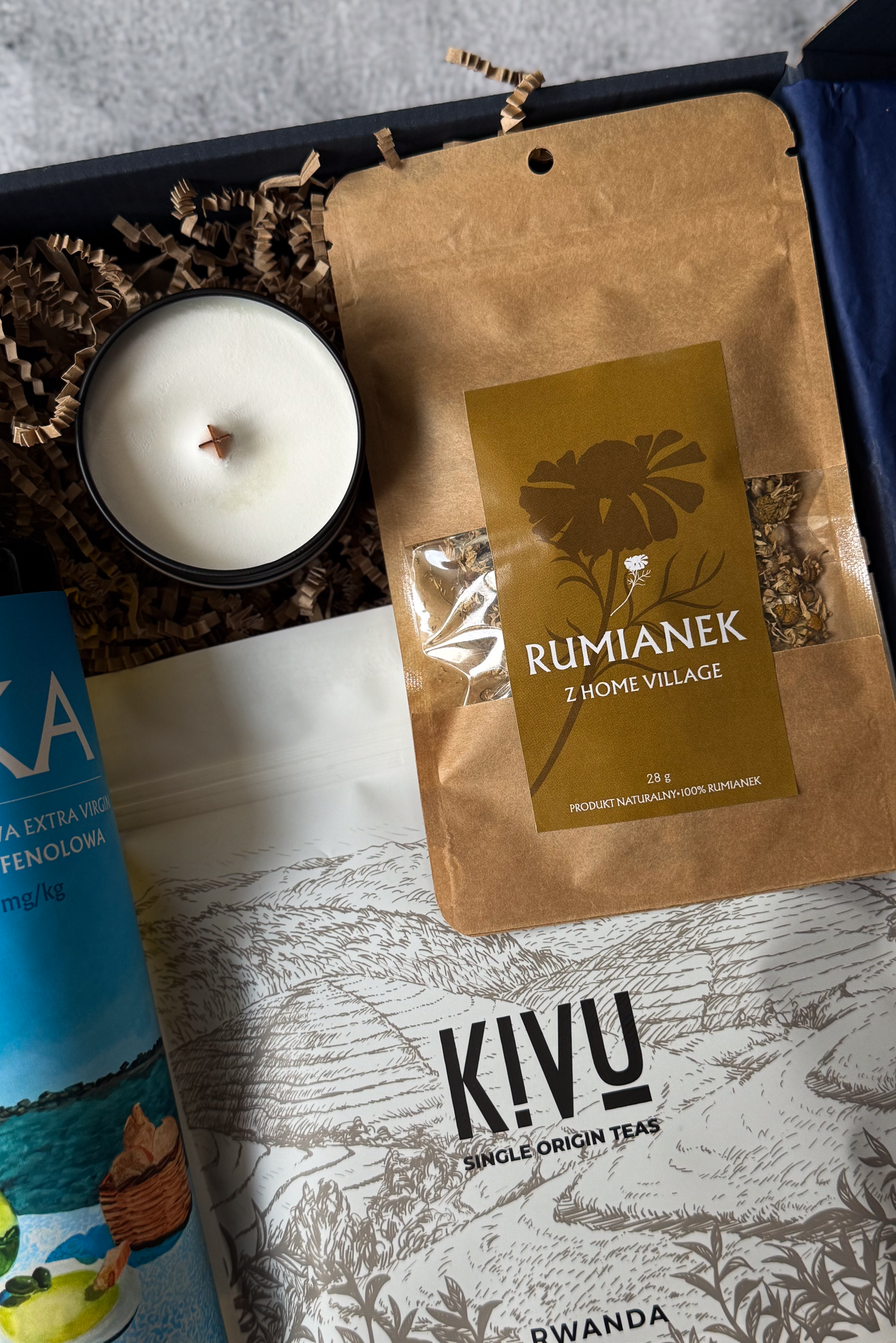 Zestaw prezentowy | Oliwa wysokopolifenolowa NIKA + świeca sojowa 100ml + zioła z Home Village + herbata czarna z Rwandy